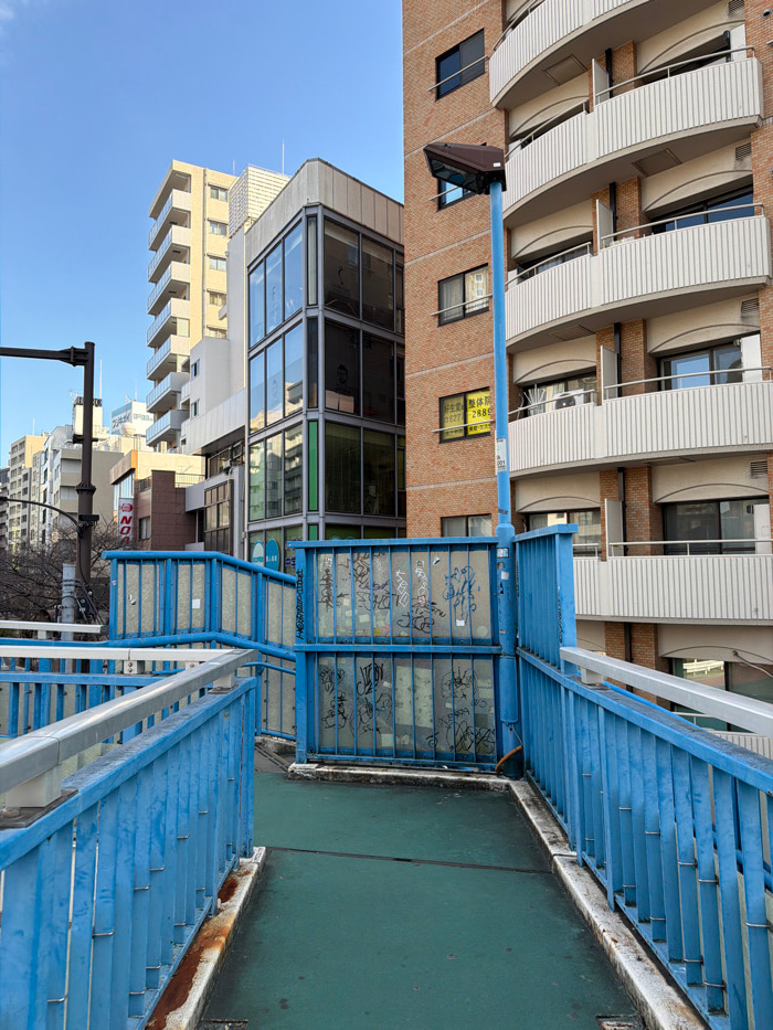 A blue overpass spans a street lined with buildings in Japan. One building has a glass facade on its lower floors. A taller, curved building rises behind it. The overpass has graffiti on its enclosed…read more