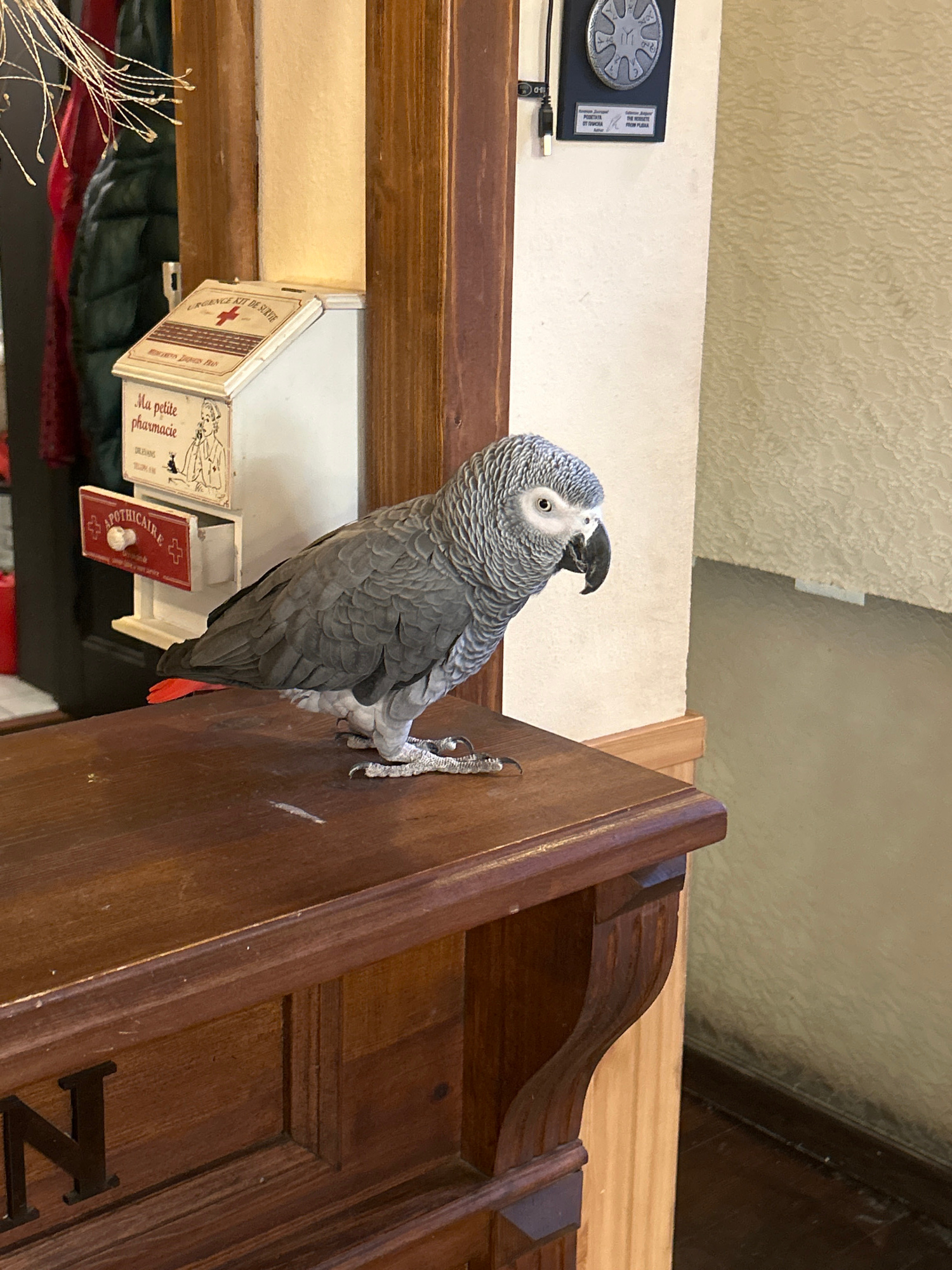 A gray parrot with red tail feathers clings to a wooden cabinet. The parrot is facing the camera with its head tilted upwards. Its beak is black, and its eyes are light. The cabinet is dark brown wood…read more