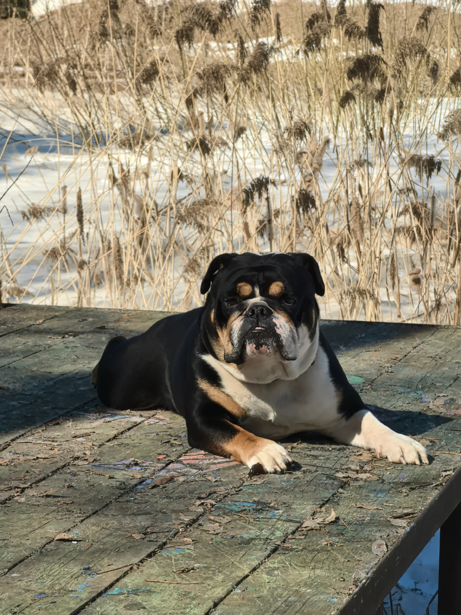 A black, tan, and white English Bulldog lies prone on a weathered, wooden deck. The deck is painted green, blue, and brown, and scattered with leaves. Behind the dog, a thicket of tall, dry, reedy plaβ¦read more