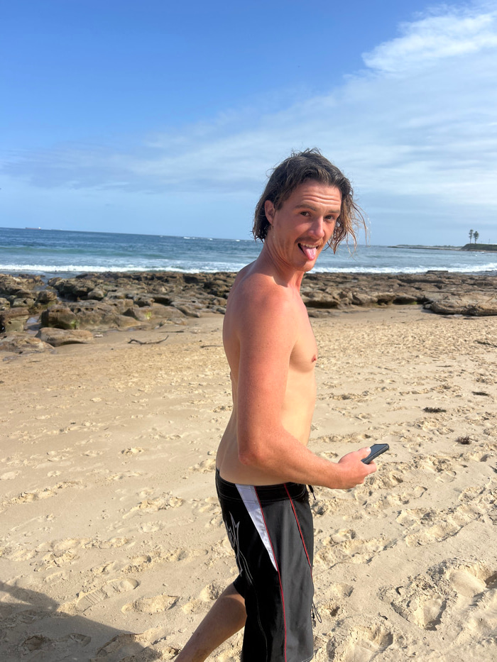 A shirtless man with reddish skin stands on a sandy beach, holding a phone in his hand. He's wearing black and white swim trunks and sticking his tongue out towards the camera. The beach is visible in…read more