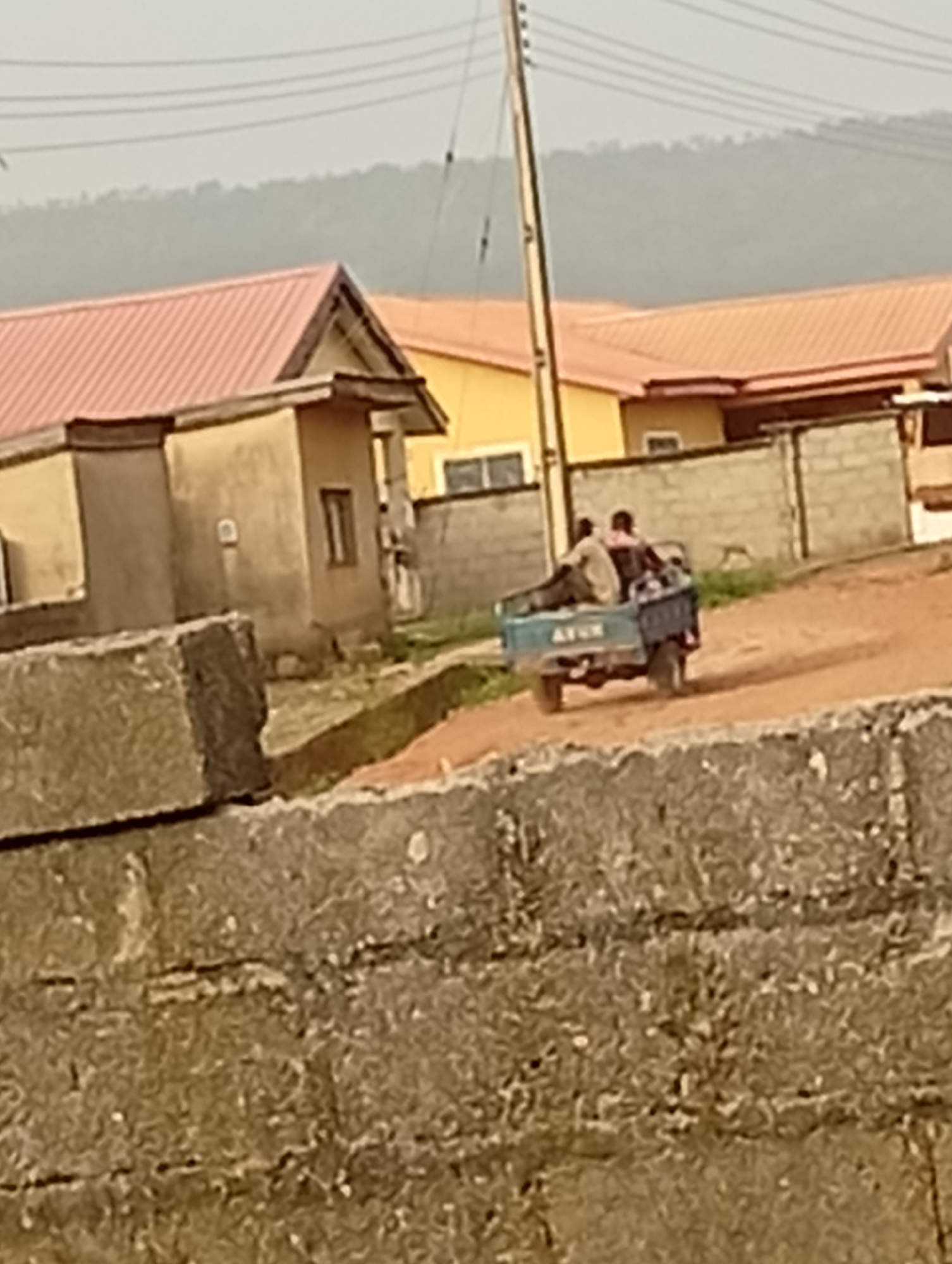 The image depicts a street scene in what appears to be a residential area of Adankolo, Nigeria. In the foreground, a rough, unpainted concrete wall partially obscures the view. Behind the wall, a thre…read more