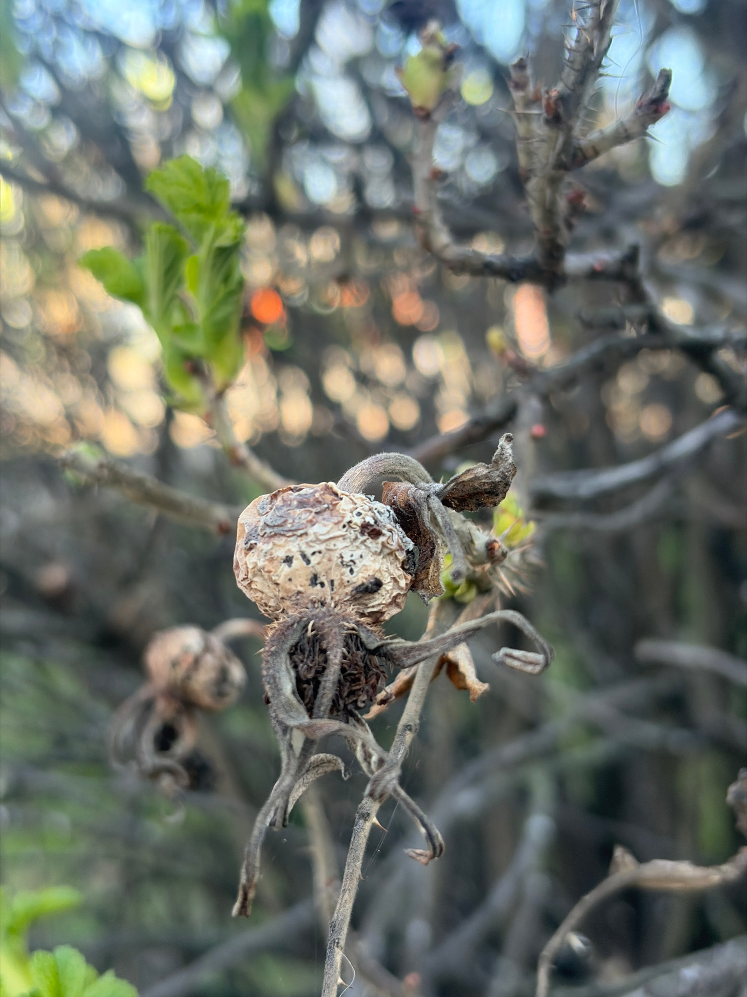 This close-up photograph features a dried, shriveled object, possibly a berry or fruit, as the primary subject, centered and in sharp focus. It is attached to a thorny, bare branch, which is also partβ¦read more