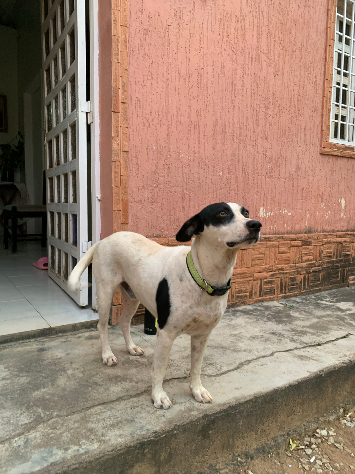 A medium shot captures a white dog with black markings standing on a concrete surface, possibly a sidewalk or driveway. The dog is wearing a green collar and is looking upwards, away from the camera.…read more