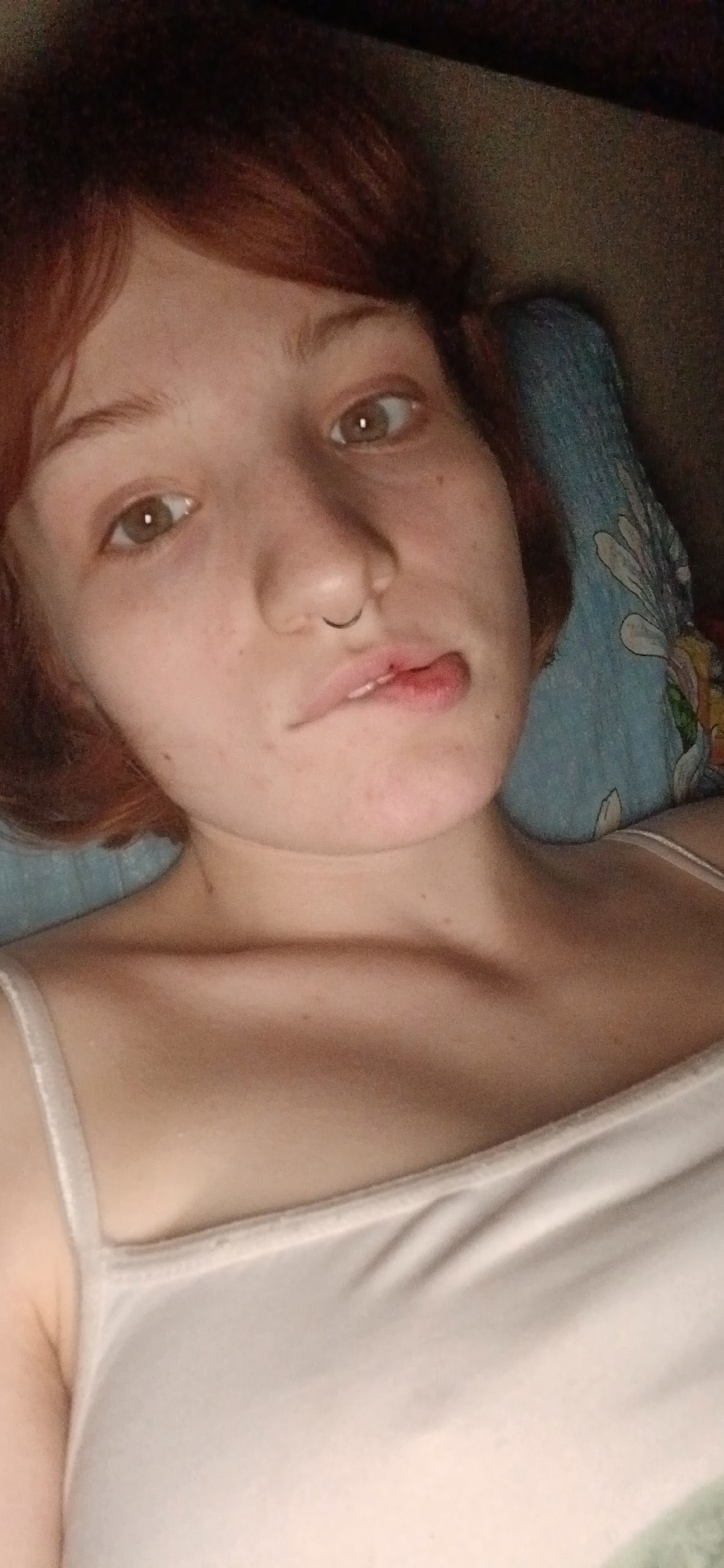 A young woman with reddish-brown hair is lying on her side, looking directly at the camera. She has fair skin with freckles and a ring piercing her nose. Her lips are slightly parted. She is wearing a…read more