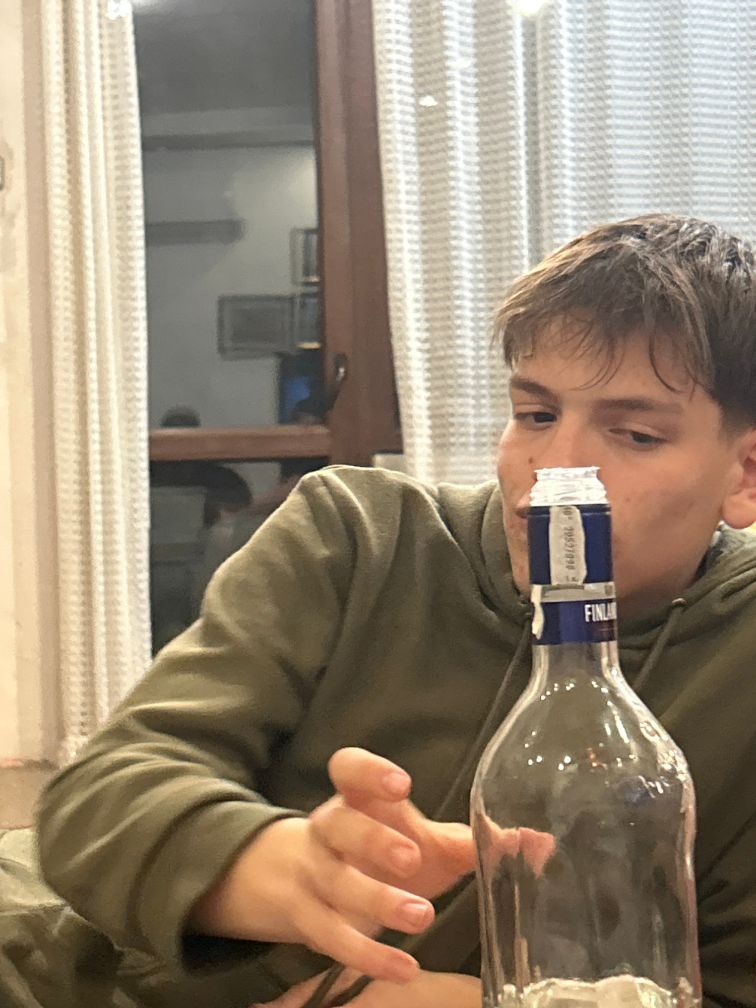 A person wearing a green hoodie is holding an empty glass bottle of Finlandia vodka in front of their face. The label is visible on the bottle neck. A window with blinds is behind the person, and a bl…read more