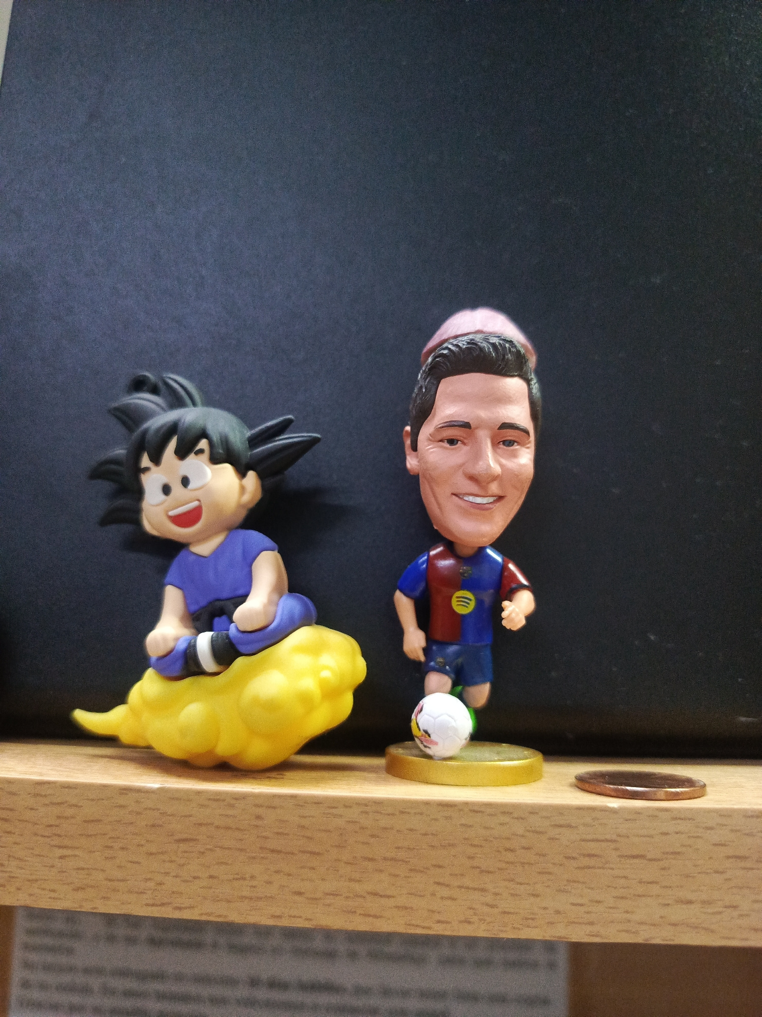 The image displays two figurines on a light-brown wooden surface, set against a dark, possibly black or dark grey, background. On the left is a figurine of Goku from Dragon Ball, depicted as a child,…read more