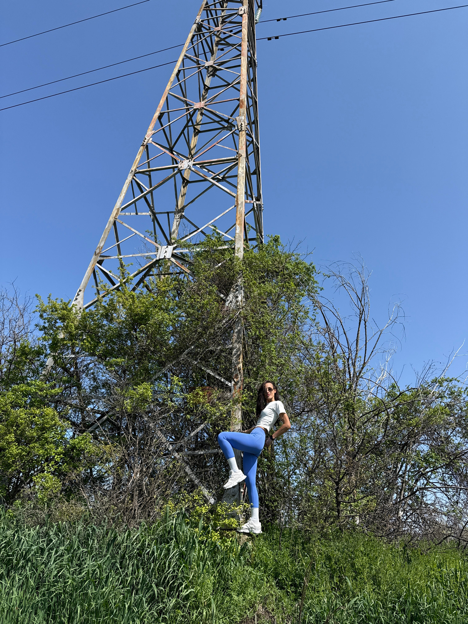 The image captures a woman posing outdoors next to a large electrical transmission tower under a clear, bright blue sky in Pleven, Bulgaria. The photograph is notably rotated 90 degrees clockwise. Th…read more
