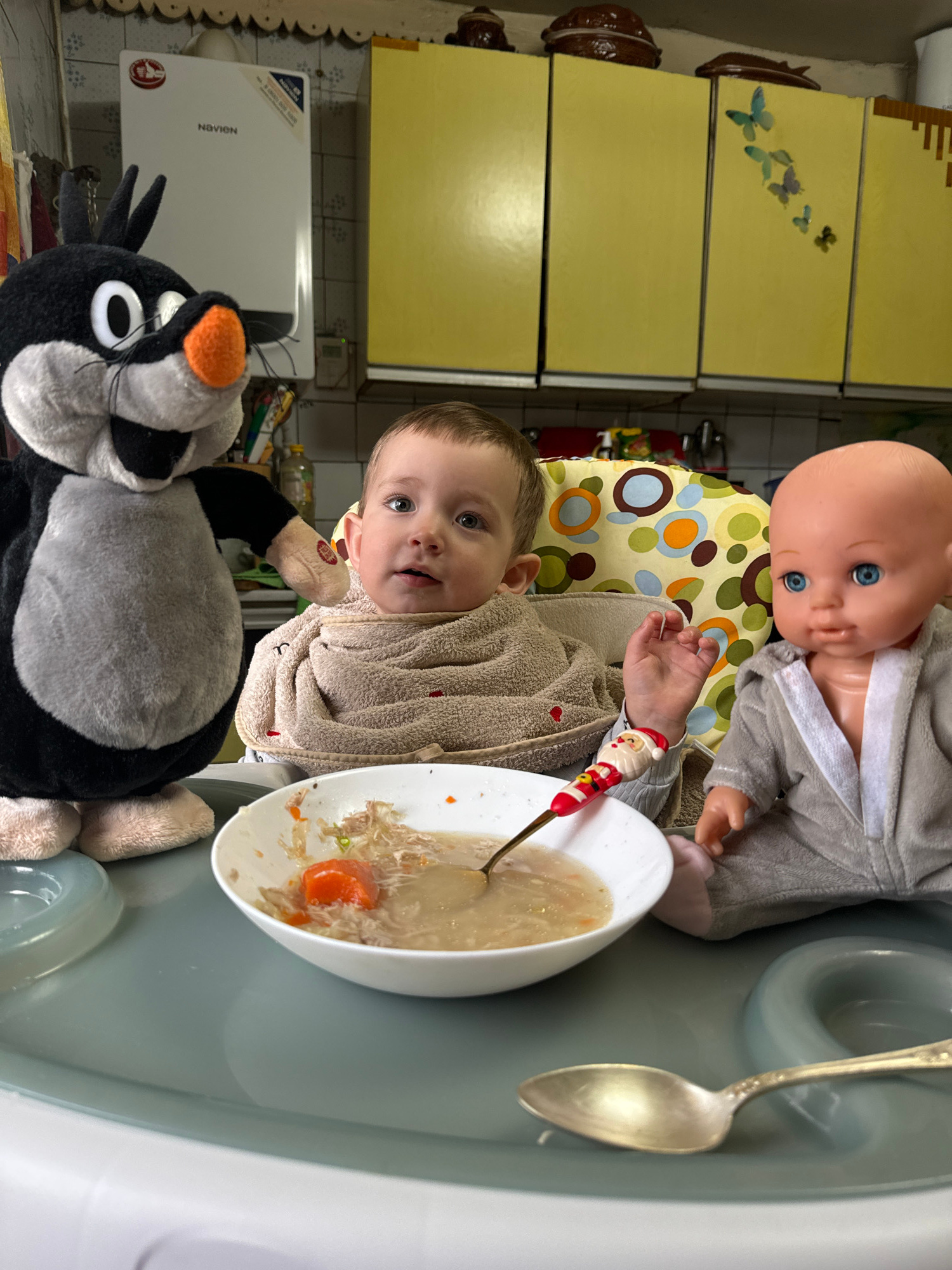 A baby sits in a high chair, facing the camera. The baby has light brown hair and light skin. The baby is wearing a beige bib. A black and white stuffed Tweety Bird is to the left of the baby. A bowl…read more