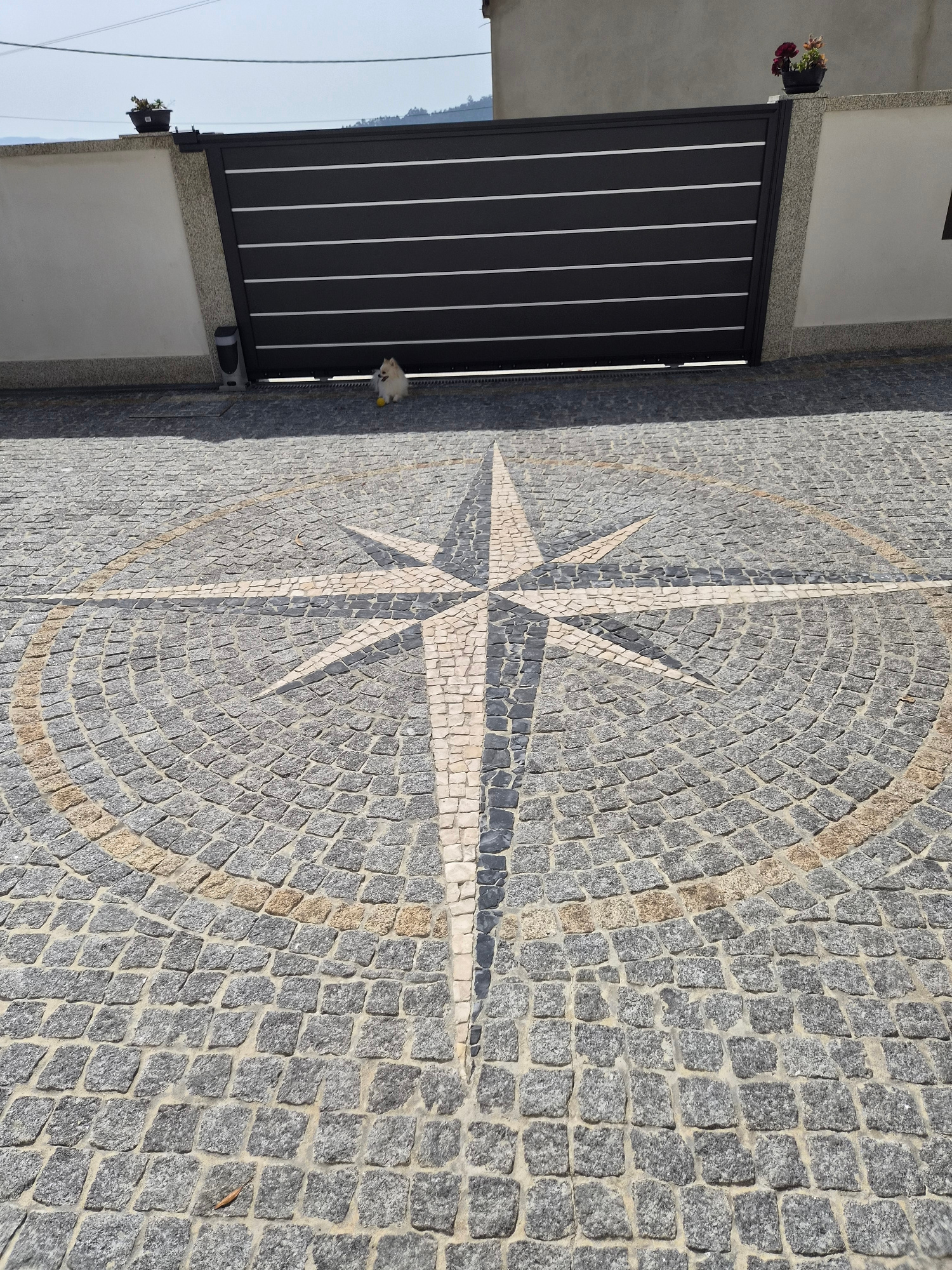 The image shows a cobblestone pavement with a large compass rose design in Barcelos, Portugal. The compass rose is composed of alternating light and dark gray stones with a circular outline of tan sto…read more