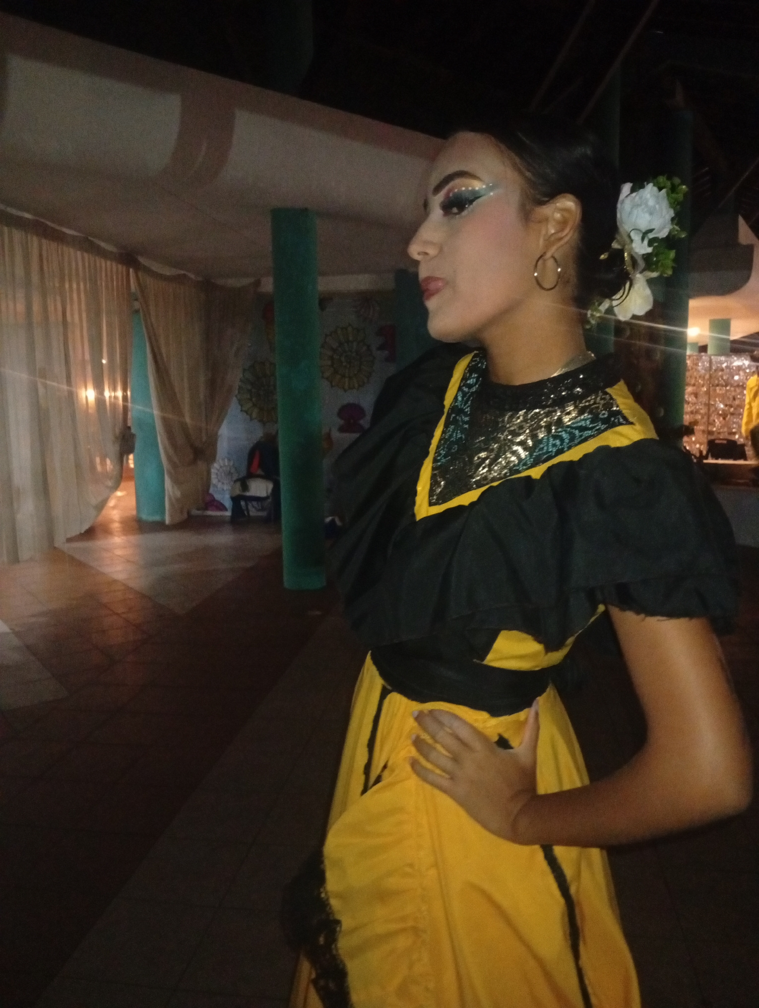 A young woman in a traditional yellow and black dress stands in a dimly lit indoor space. The dress features a sequined collar, puffed sleeves, and a sash at the waist. She wears gold hoop earrings an…read more