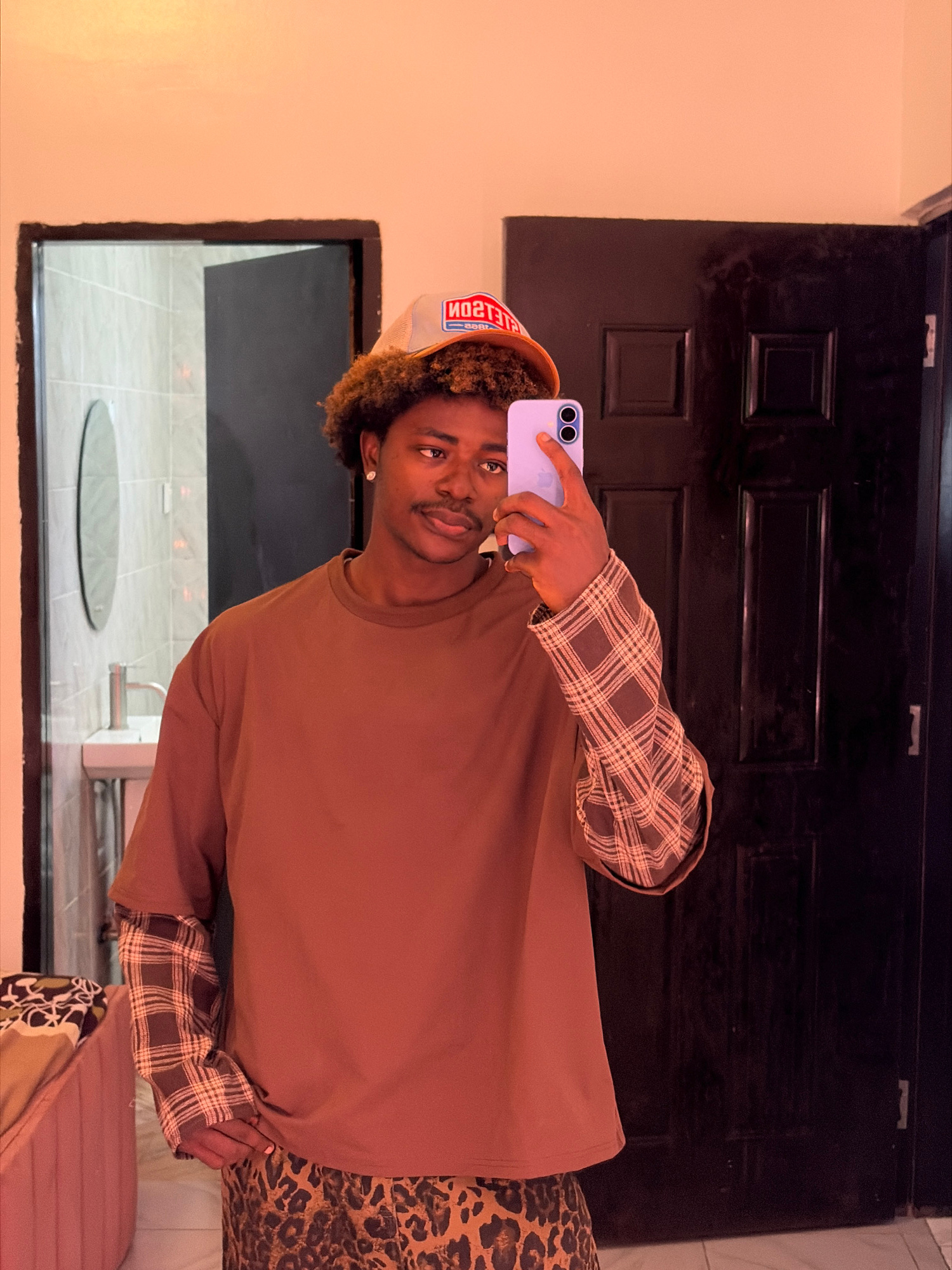 The image shows a young man with dark skin and curly, light-brown hair taking a selfie in what appears to be a bathroom. He is wearing a tan t-shirt over a plaid-sleeved shirt and a hat with a logo in…read more