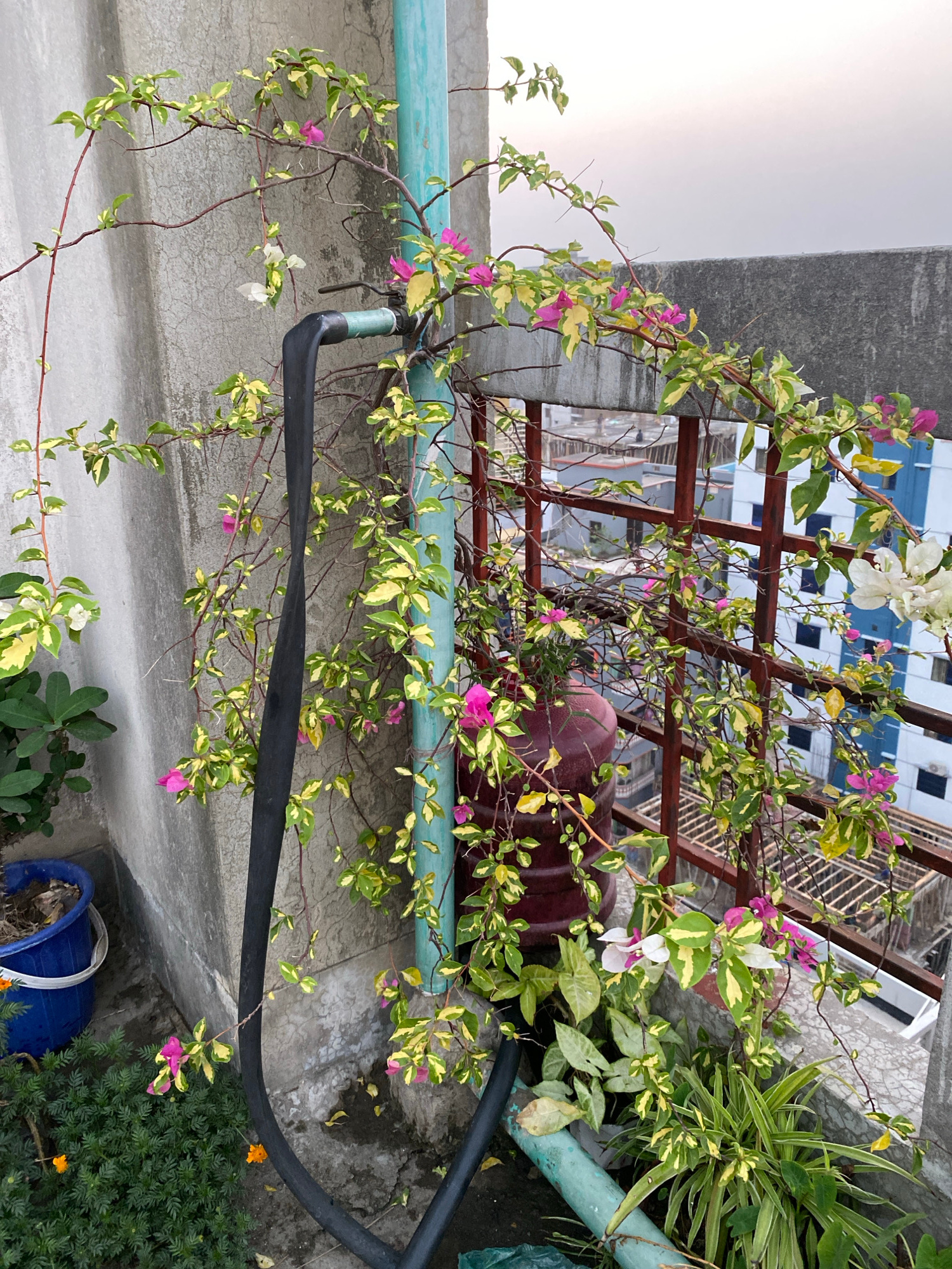 The image provides an overhead view of a vibrant, variegated bougainvillea plant flourishing on what appears to be a rooftop or balcony garden in Dhaka, Bangladesh. The bougainvillea features striking…read more