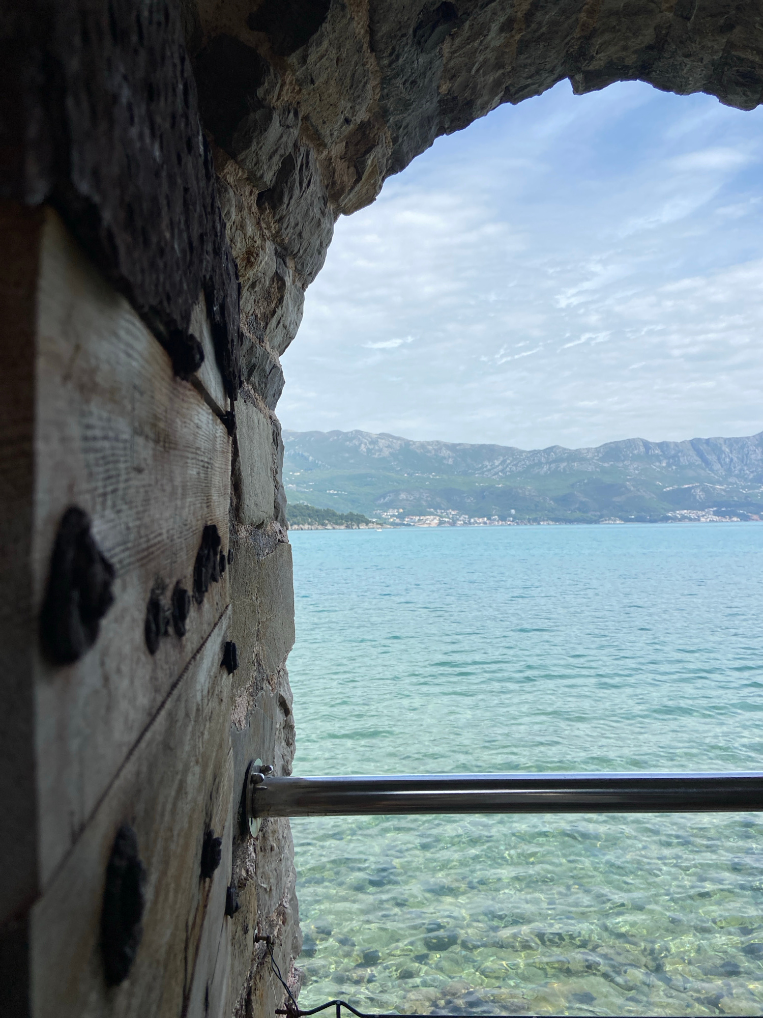 The image, displayed on its side and rotated 90 degrees clockwise, captures a picturesque view from within an old stone structure, looking out over a large body of water toward a distant mountainous c…read more