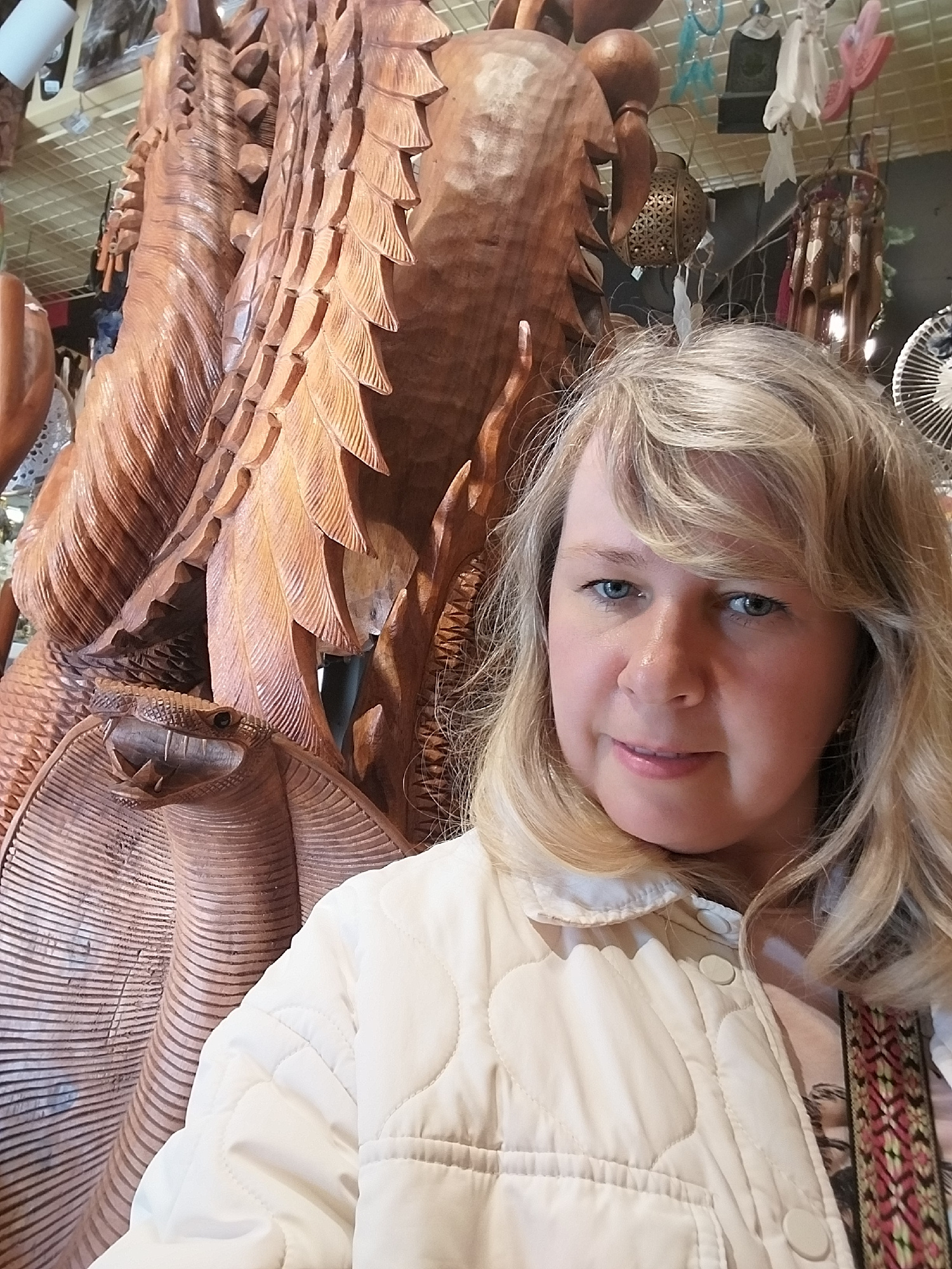 A young woman with blonde hair and blue eyes is captured in a close-up, slightly angled selfie, offering a gentle smile. She is wearing a light-colored, possibly cream or off-white, quilted jacket. He…read more