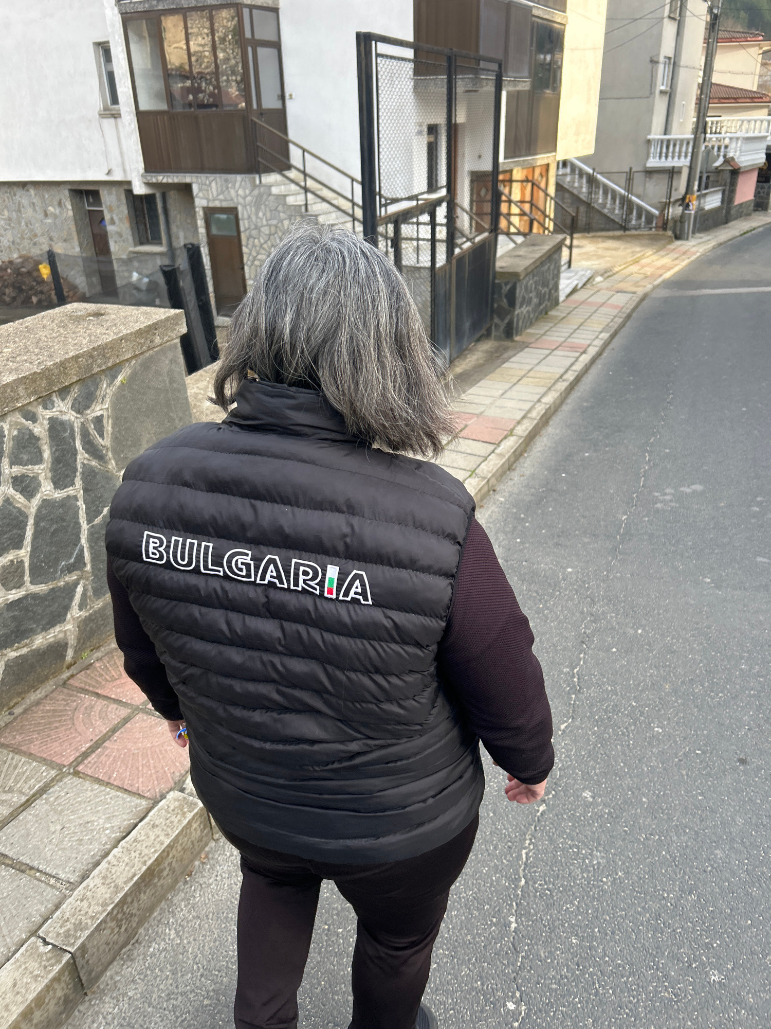 The image shows an adult with gray hair wearing a black puffy vest that reads "BULGARIA" down the back in white letters, with the "I" adorned with the Bulgarian flag. They are standing on a sidewalk in Zlatograd, Bulgaria. The sidewalk is bordered by an asphalt road on one side and a stone retaining wall on the other. Buildings are visible in the background. The person appears to be walking. | Open Wire