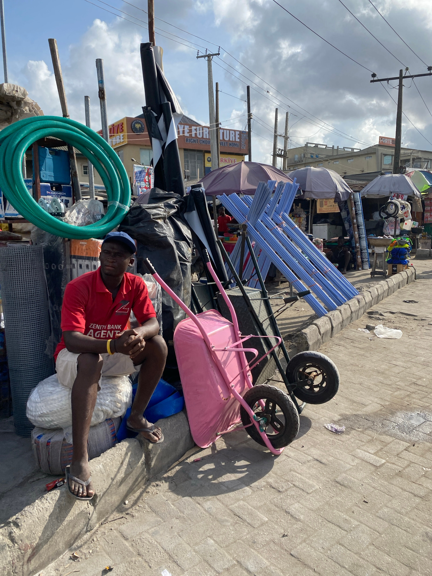 A man sits next to a sidewalk on what appears to be a pile of wares in Lekki, Nigeria. He is wearing a red t-shirt, blue cap, and sandals. The shirt has "ZENITI BANK AGENT" printed on it. The wares ne…read more