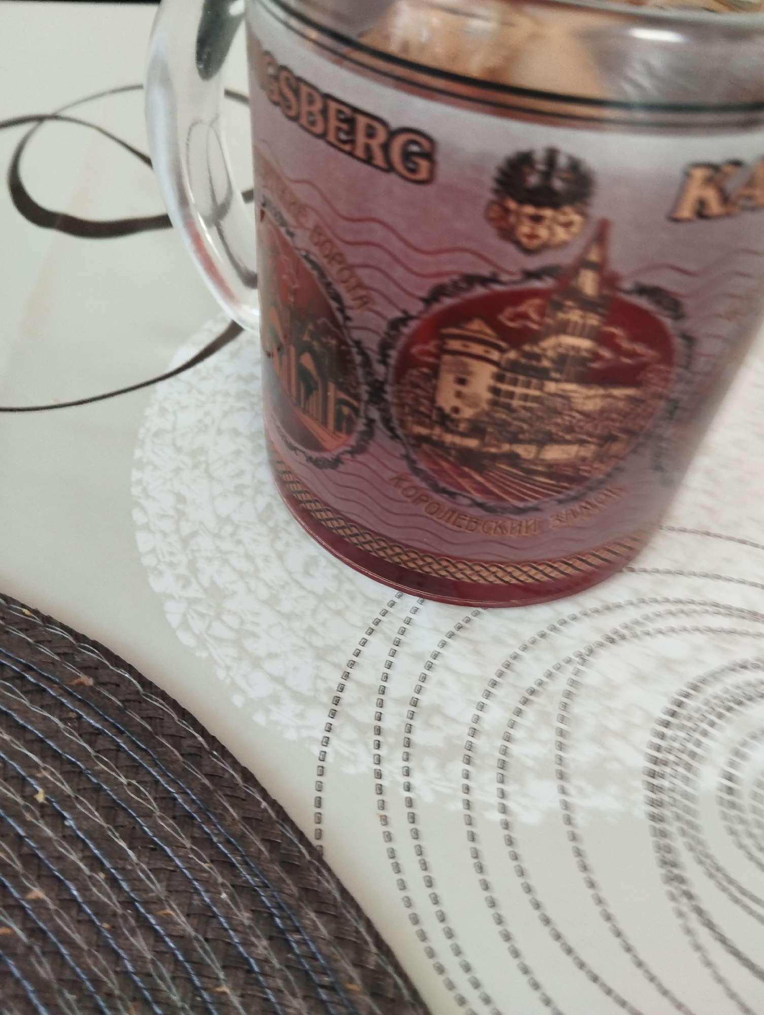 A close-up shot shows a mug with the text "KÖNIGSBERG" printed on it, possibly referencing the former German city now known as Kaliningrad. The mug features a design of a castle or fortress, with text…read more