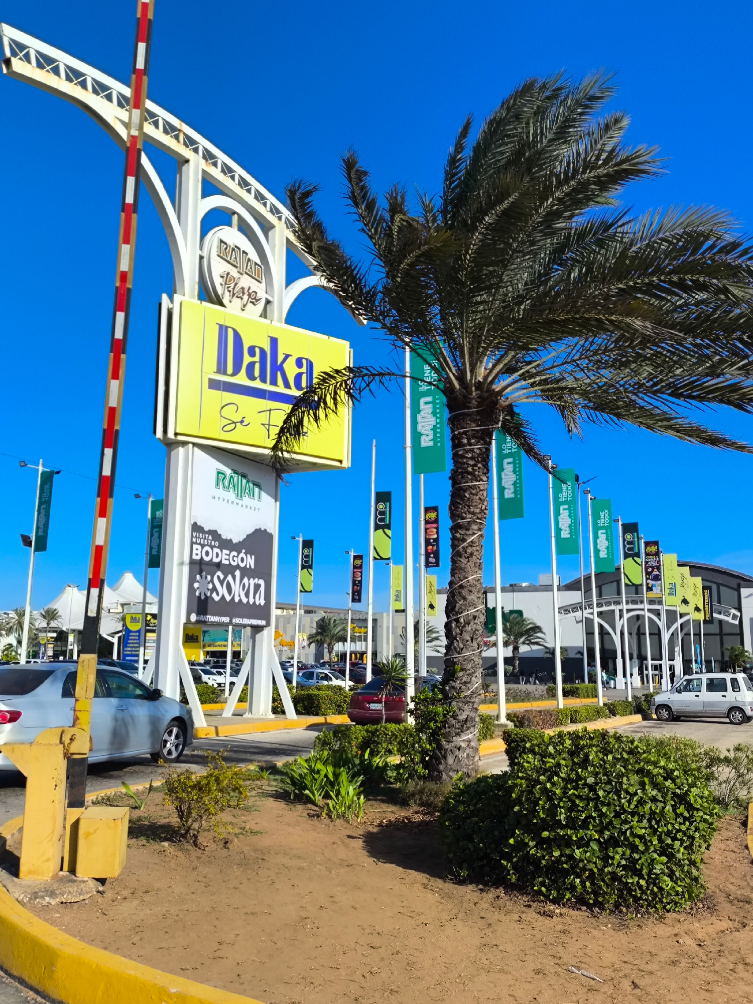 Here is a detailed description of the image: The image presents an exterior view of a shopping plaza, likely located in Pampatar, Venezuela, based on the branding elements present. The sky is a brigh…read more