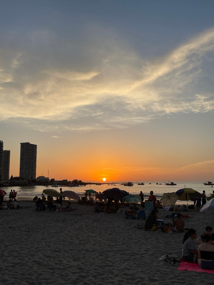 A seaside sunset unfolds with warm orange hues dominating the horizon where the sun descends. Silhouetted figures of beachgoers, umbrellas, and boats populate the sandy shore and water. Buildings punc…read more