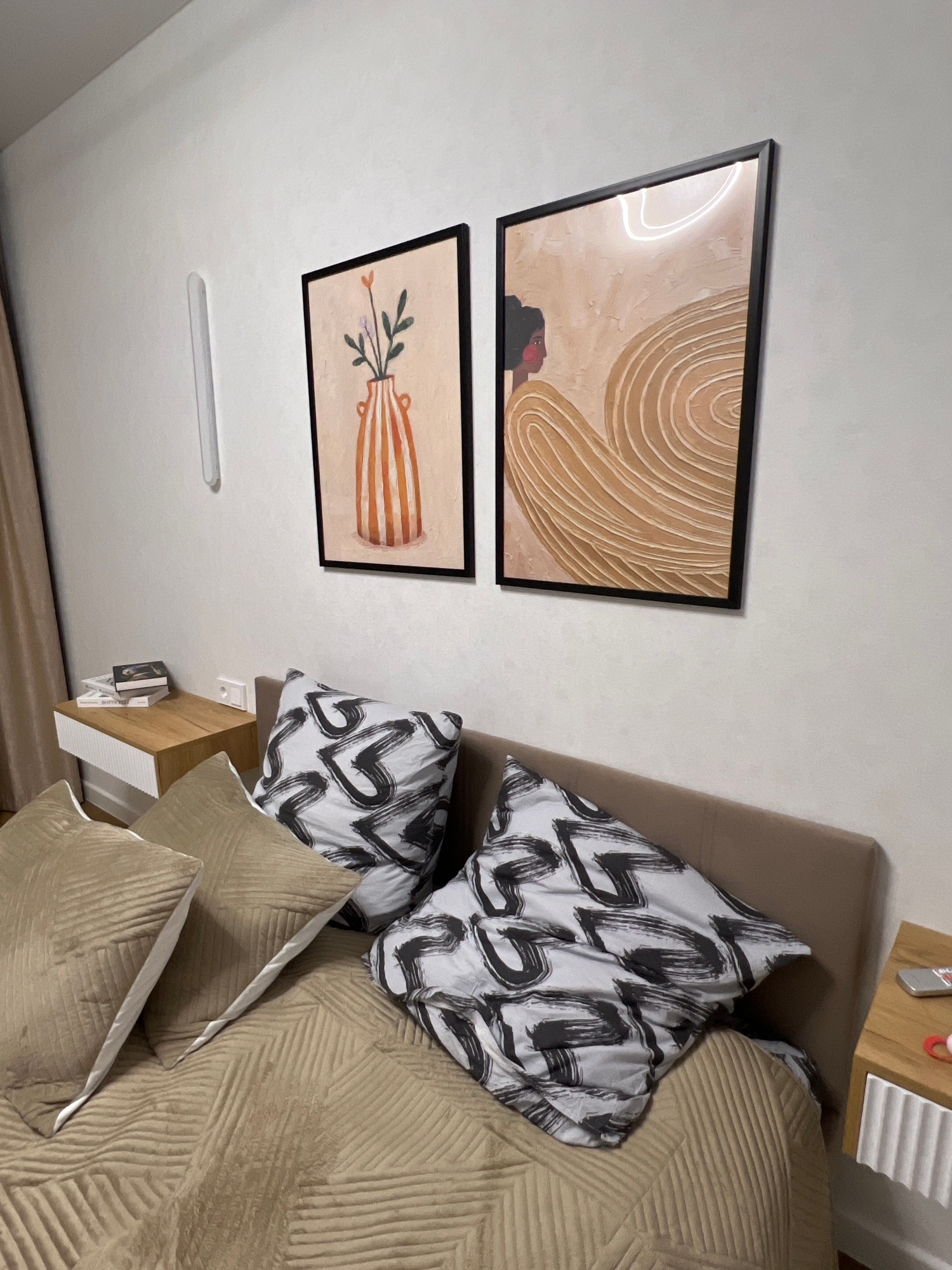A still life composition inside a room, likely a bedroom, featuring bedding, artwork, and side tables. Two framed art prints are positioned on the wall, one above the other. The upper print depicts an…read more