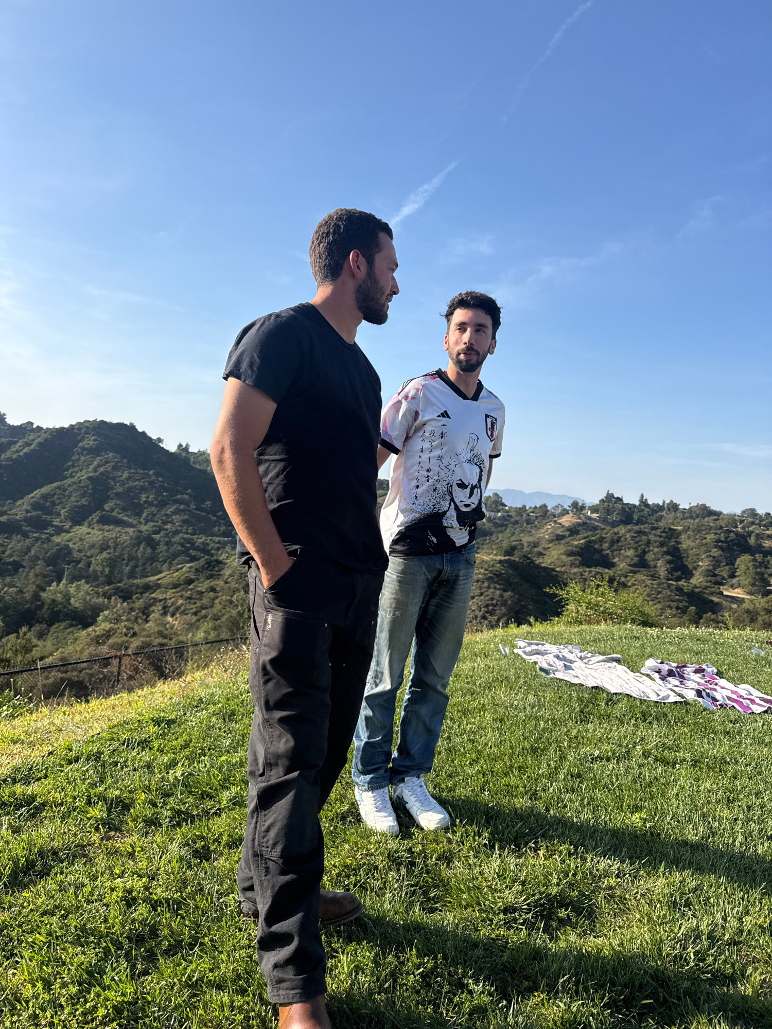Two men are standing in a grassy field on a sunny day. One man is wearing a black t-shirt and black pants with brown shoes, and he is looking up at the other man. The other man is wearing a white t-sh…read more