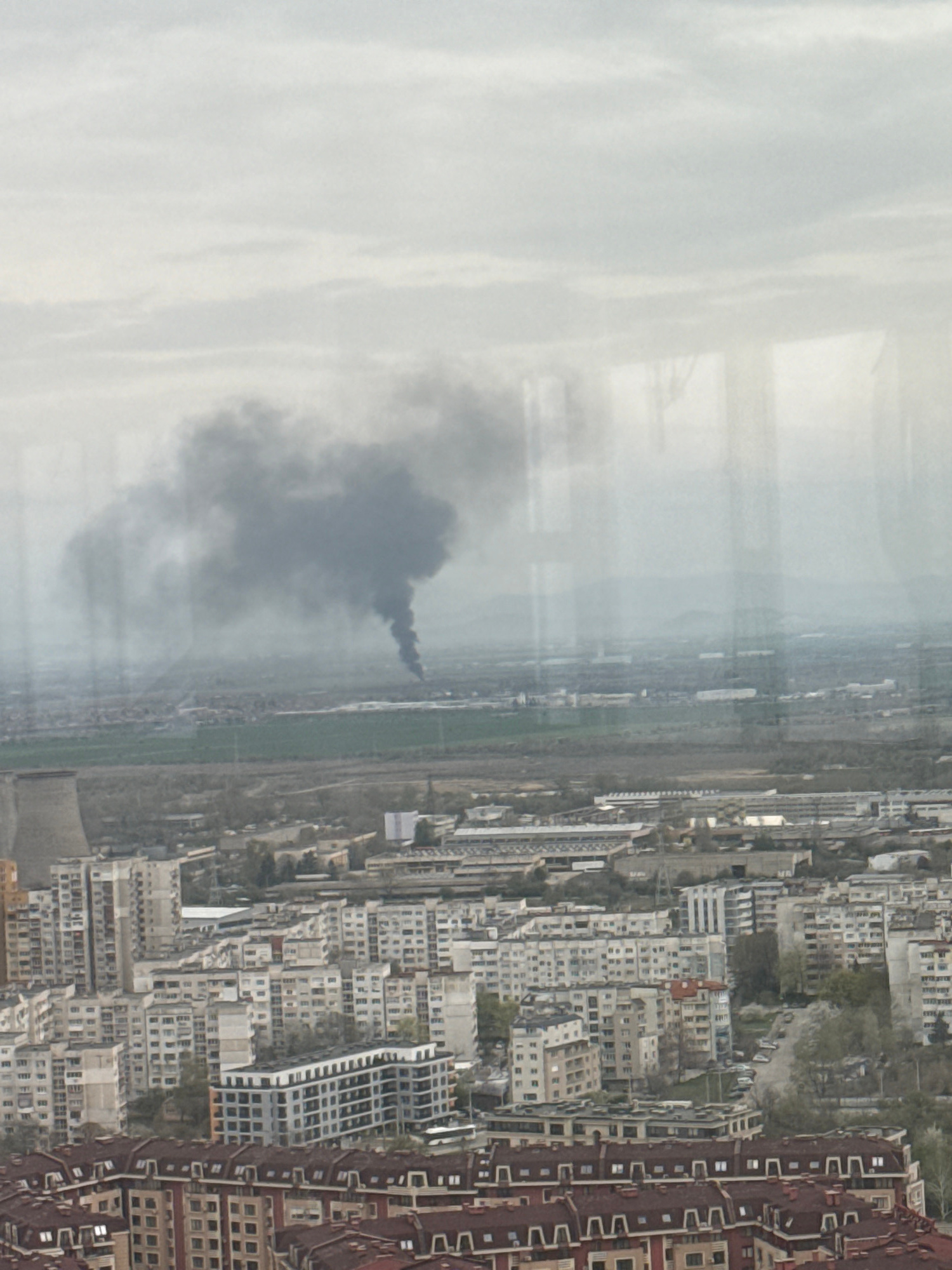 This landscape image, appearing to be taken through a window with some haziness or reflections, captures an urban environment under an overcast sky, dominated by a large plume of dark smoke. The sky i…read more