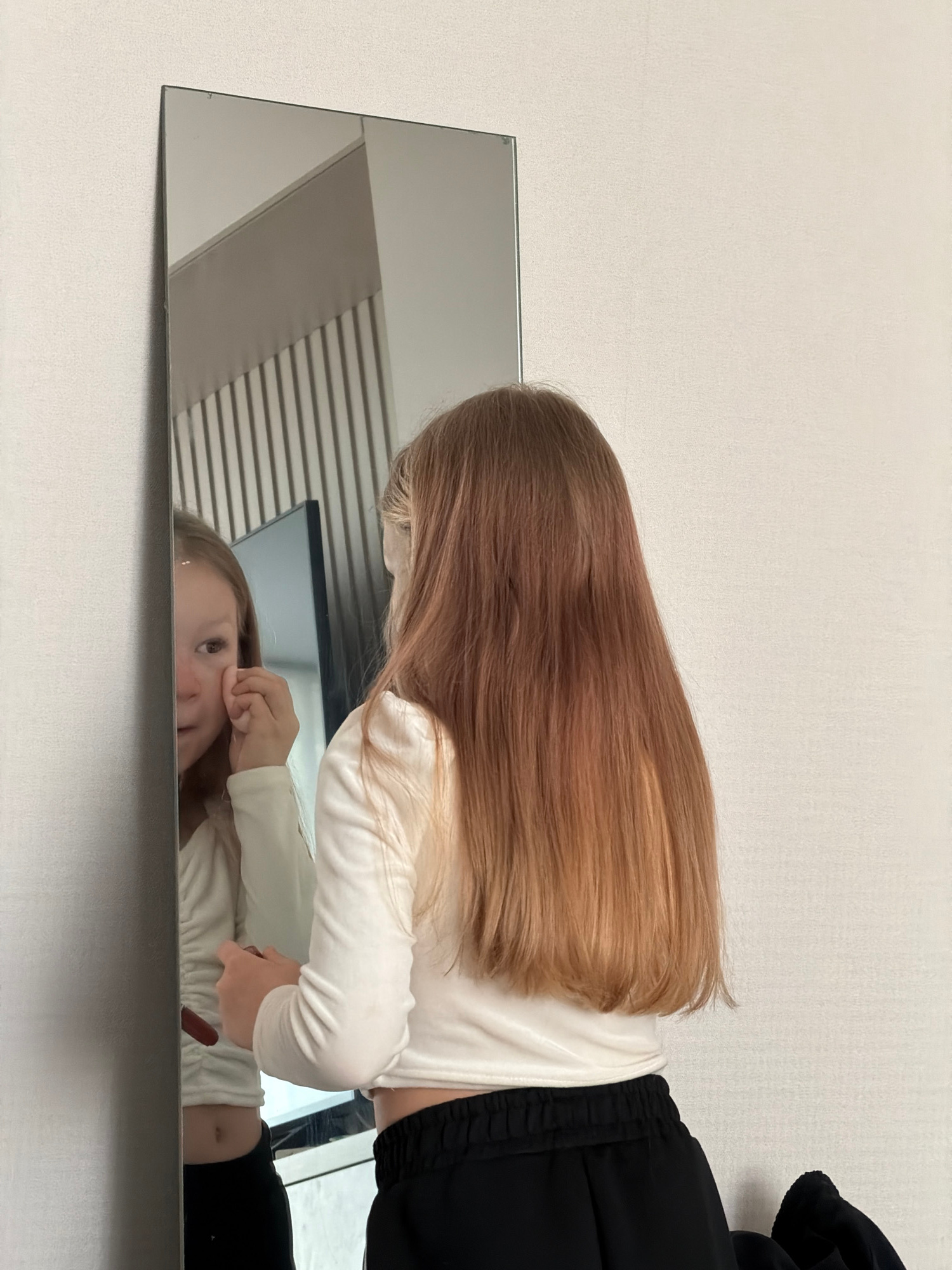 A young girl stands in front of a mirror. She is wearing a white long-sleeved shirt and black pants. Her brown hair is long and straight. She is touching her face in the mirror. The background is a pl…read more