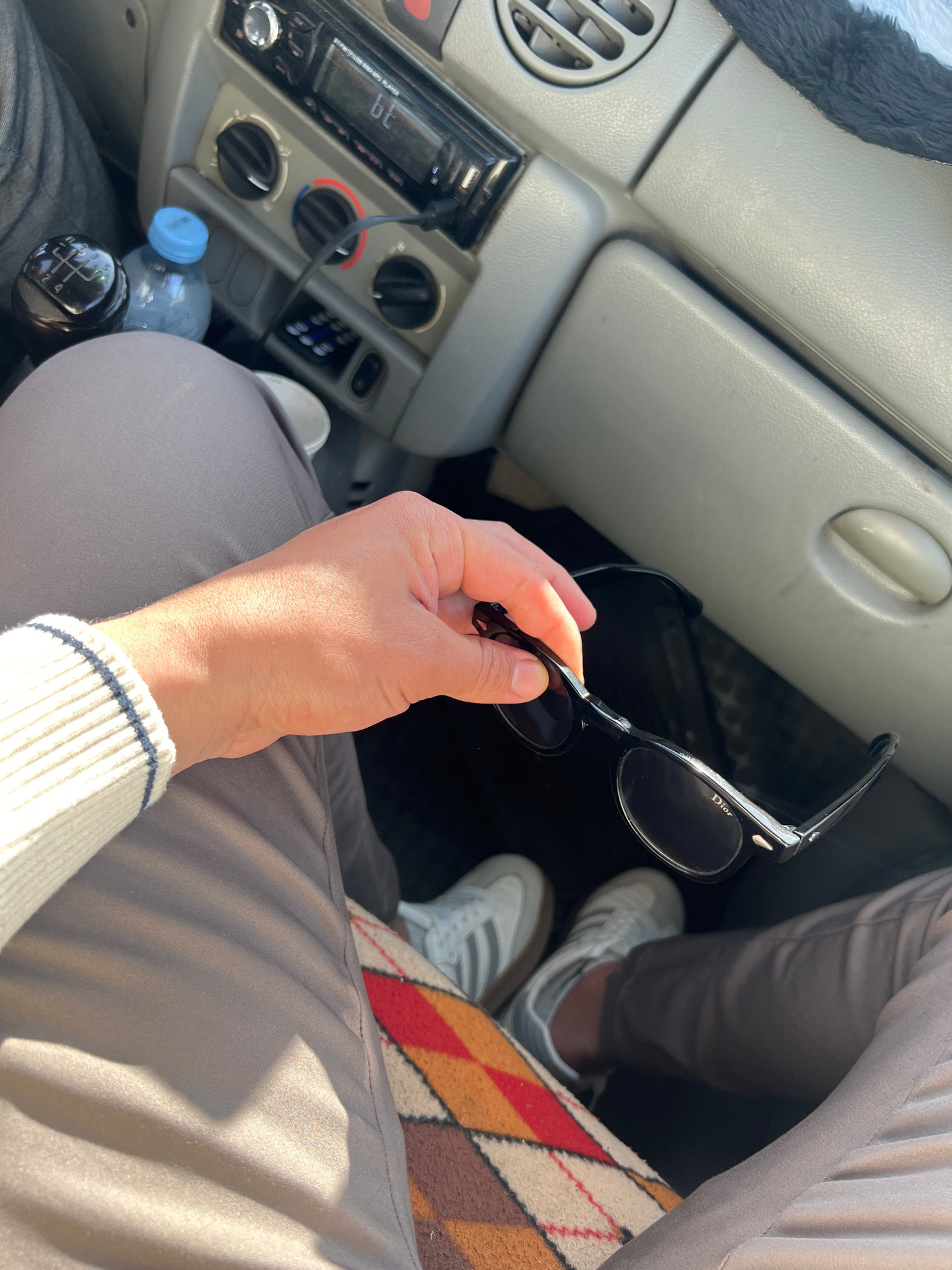 Inside a vehicle, an individual holds a pair of black sunglasses in their hand. The car's interior is visible, including the dashboard, radio, climate controls, gear stick, and a water bottle. Parts o…read more