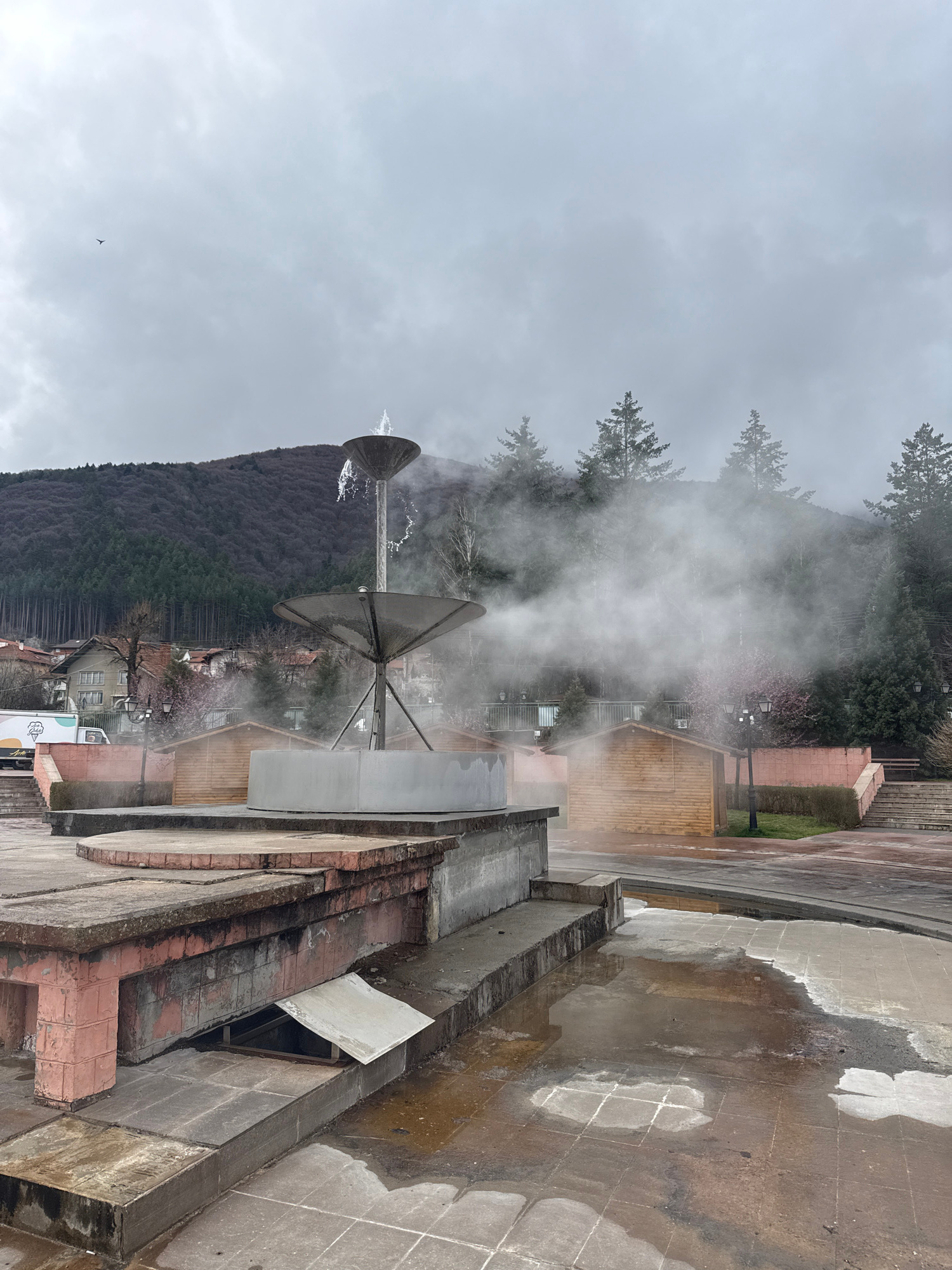 The image depicts a geyser in Sapareva Banya, Bulgaria. The geyser is a prominent feature, emitting a large plume of steam into the air. In the background, there is a mountain covered with trees, some…read more