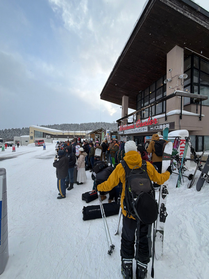 The image depicts an outdoor winter scene, likely at a ski resort, bustling with people. The perspective is slightly elevated, looking down on a crowd. On the right side of the frame, a multi-story b…read more