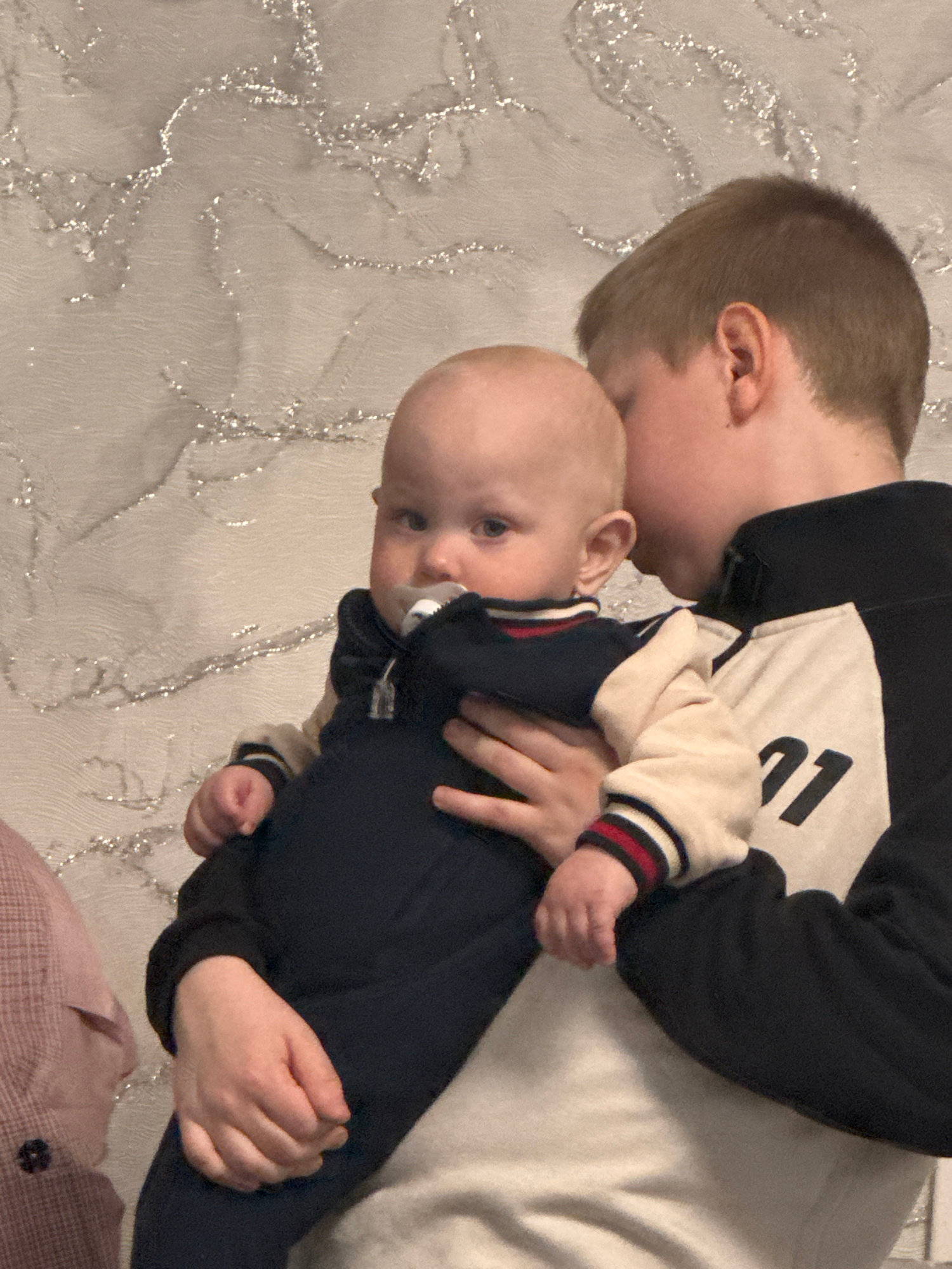 This image captures an intimate indoor moment between two individuals in Chaikovsky, Russia. An older child, likely a boy with short light brown hair, is seen holding an infant. The older child is wea…read more