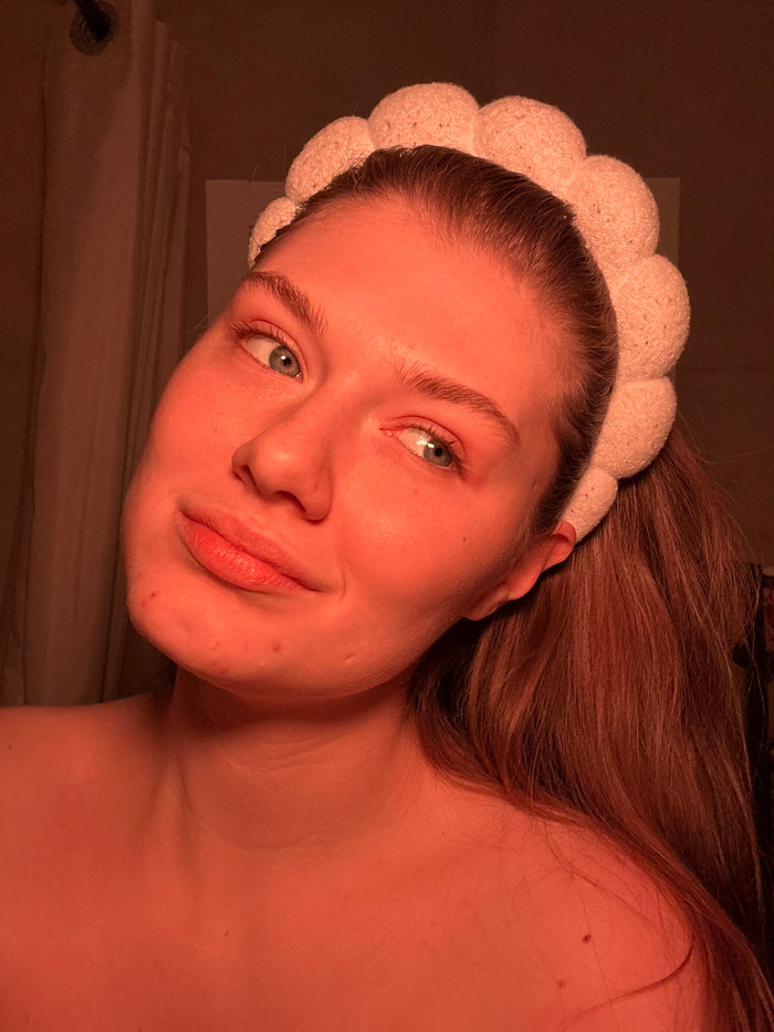A fair-skinned woman with blonde hair is tilted slightly to the right. She has a white headband with a bubbly texture. Her eyes are light and she gazes to the left. The light in the image gives off an…read more