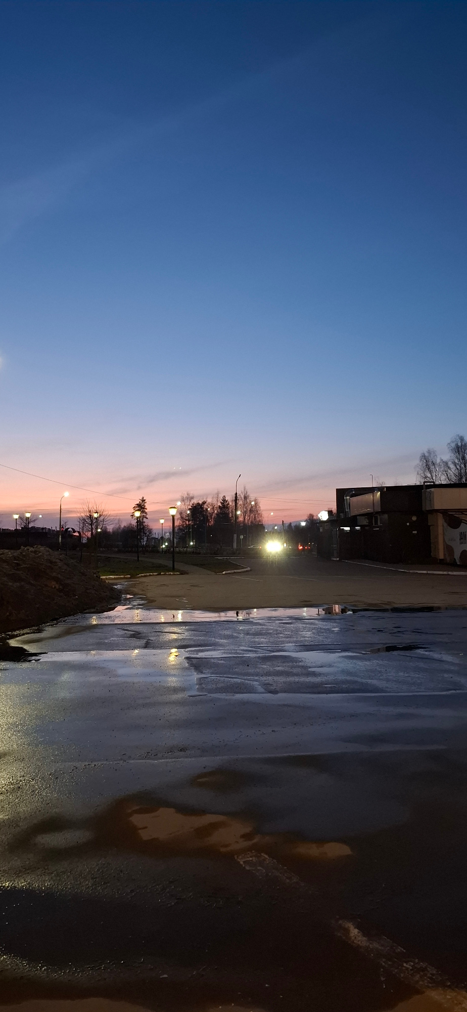 The image captures a street scene in Chaikovsky, Russia, at twilight. The sky transitions from deep blue to orange near the horizon. Along the street, numerous illuminated lampposts are visible, along…read more