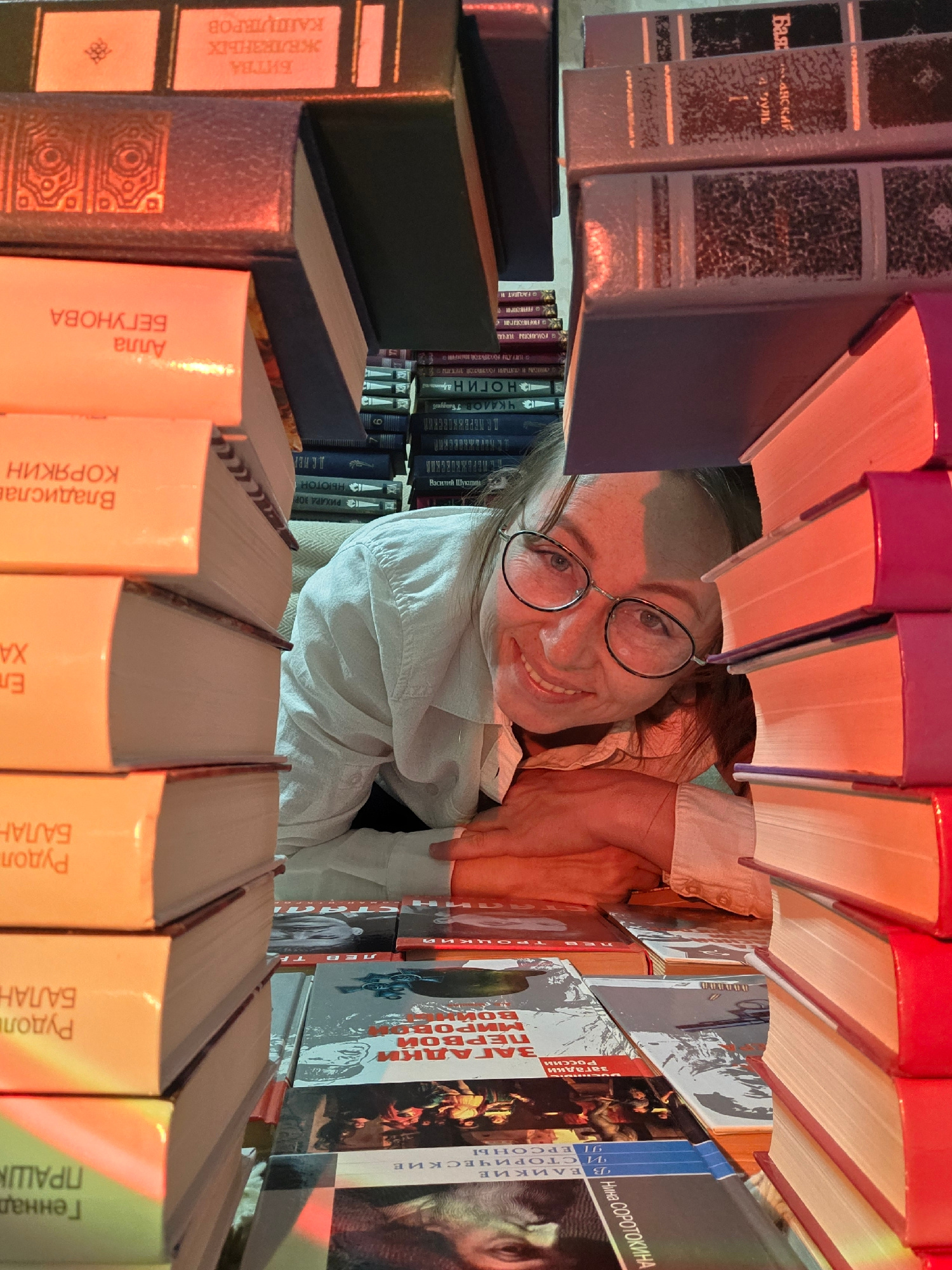 The image is taken from a low angle, looking up between two shelves of books. A person is looking down through the gap between the shelves, wearing glasses and a white shirt. Many of the book spines a…read more