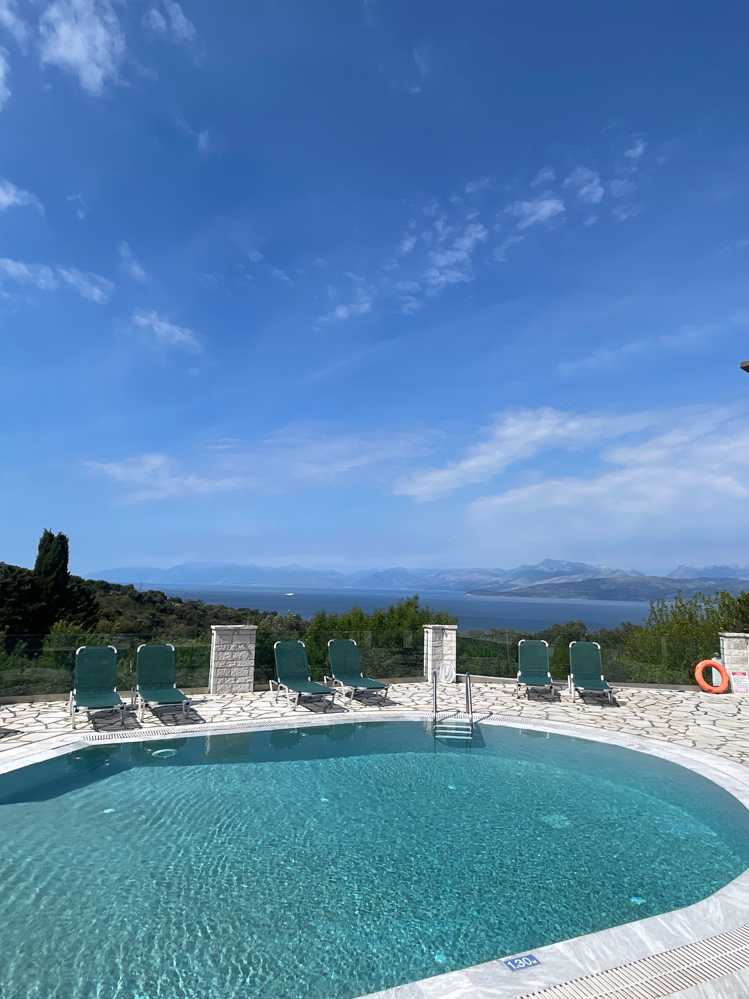The image shows a swimming pool in the Kassopaia Municipal Unit, Greece. The pool is an oval shape with a white border. There are lounge chairs next to the pool, and a life preserver is attached to a…read more