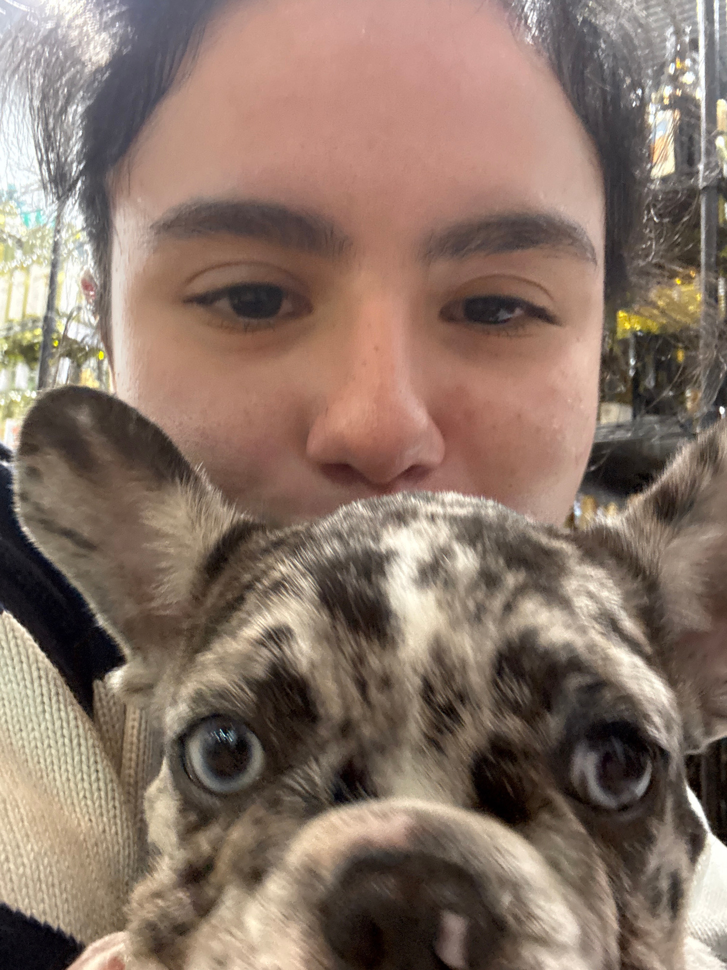 A close-up, slightly blurred selfie features a person with dark hair and brown eyes positioned on the left. The person's face is partially obscured by a brindle-patterned dog with light-colored eyes p…read more