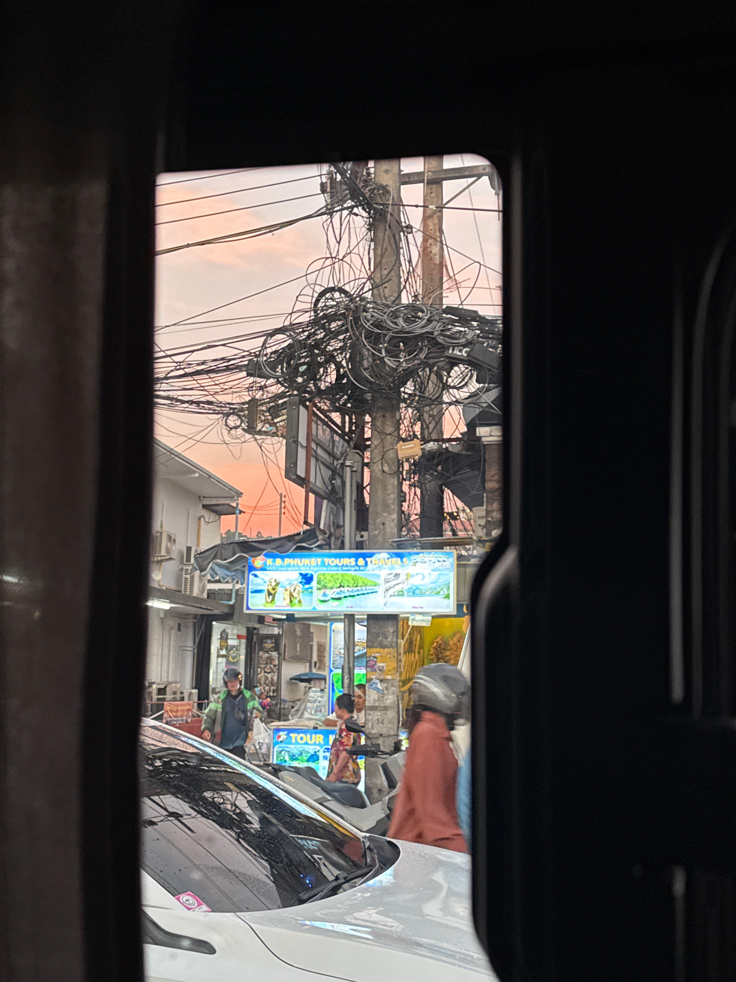 The image, taken from within a vehicle, shows a street scene in Patong, Thailand. Power lines are densely tangled above a street with shops and vendors. People are walking and riding motorcycles. A wh…read more