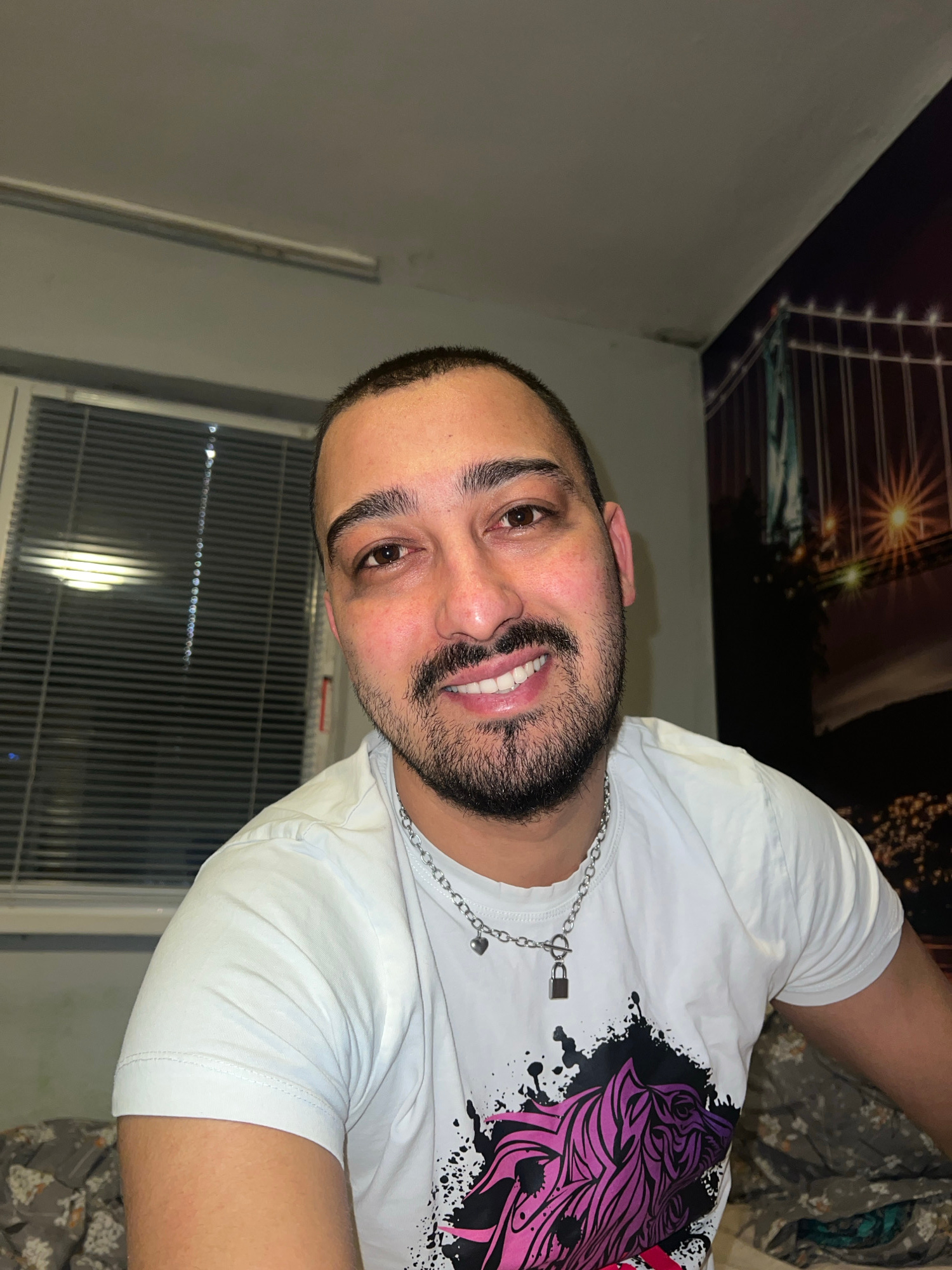 A man with short dark hair and a beard is smiling at the camera. He is wearing a white t-shirt with a black and pink design and a silver chain necklace. He appears to be indoors, with a wall and windo…read more