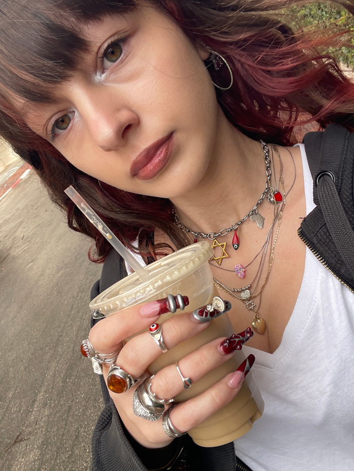 A young woman is depicted from the chest up, positioned slightly to her left, looking towards the camera. Her hair is dark brown with bangs, featuring reddish-auburn highlights in the longer sections…read more