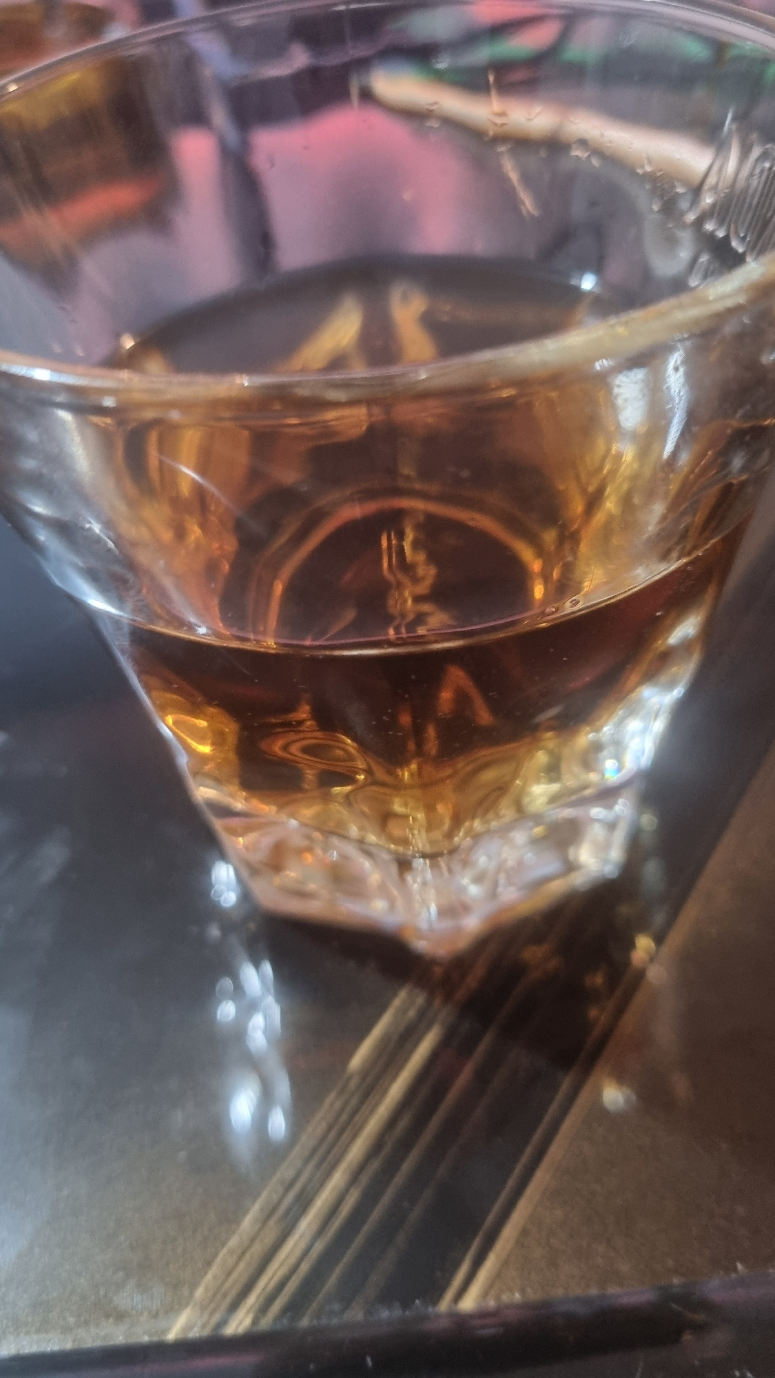 The image shows a close-up view of a glass containing a light brown liquid, likely whiskey or bourbon, sitting on a dark, reflective surface with linear patterns. The glass itself has a thick base and…read more