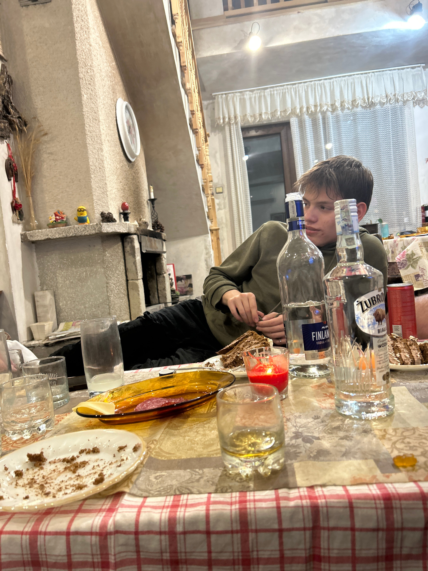 The image depicts a table setting with food and alcoholic beverages indoors. Two bottles of liquor, one "Finlandia Vodka" and one "Zubrowka Bison Brand Vodka" are prominently displayed on the table. A…read more