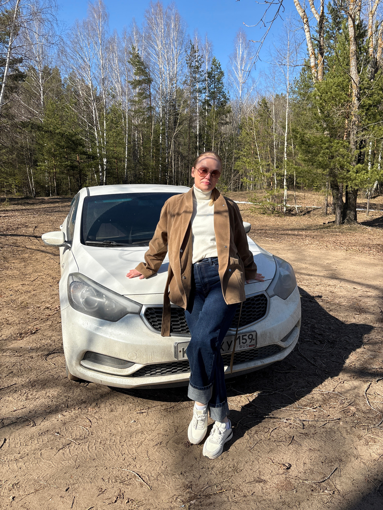 A young person is pictured lying horizontally across the hood of a white car, which is parked on a dirt path within a wooded area. The individual wears fashionable round sunglasses, a white turtleneck…read more