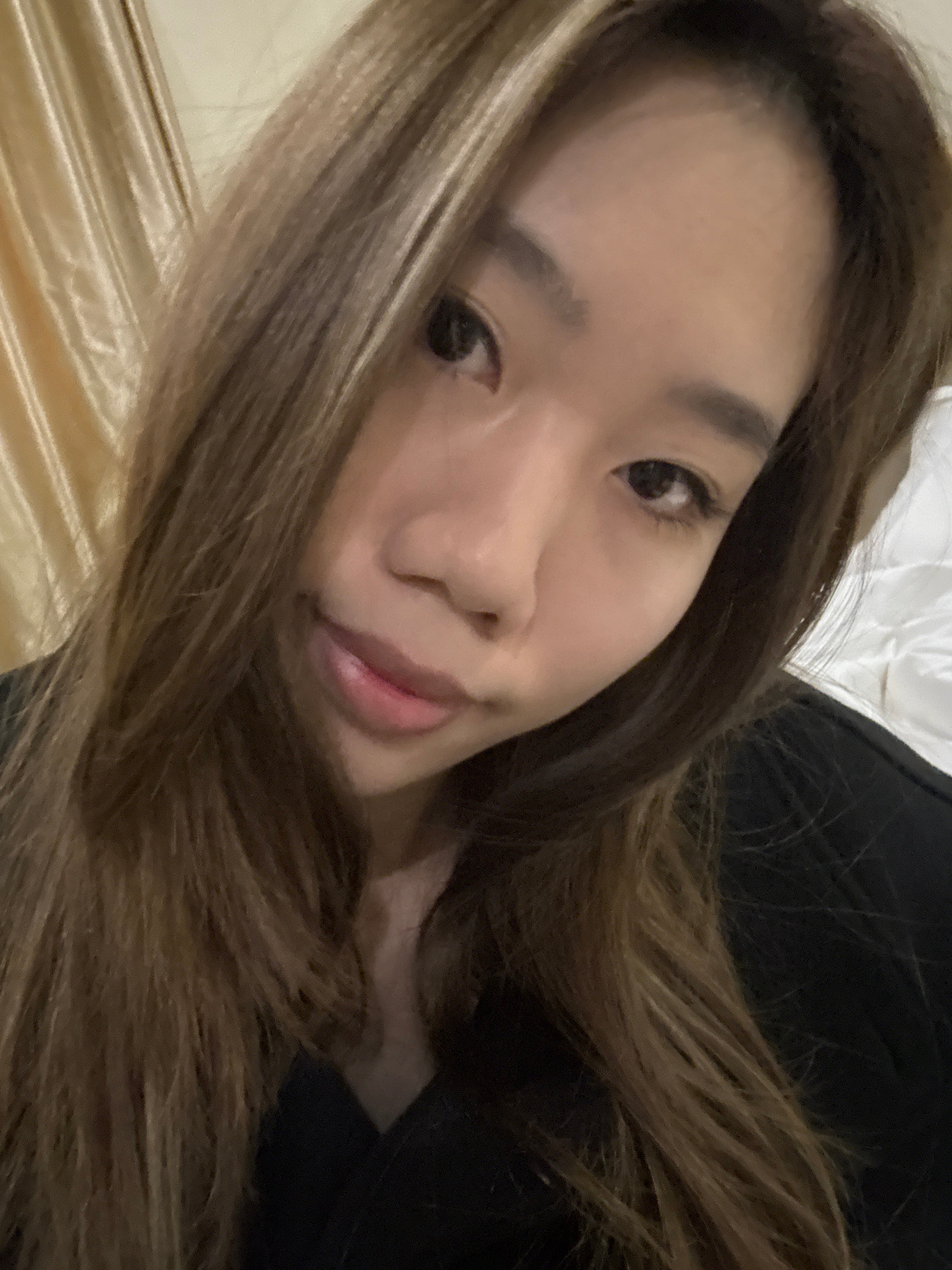 A close-up, selfie-style photograph depicts an Asian woman with long brown hair. Her hair is styled to fall across her face and shoulders. Her facial features are clearly visible, including her eyes,…read more