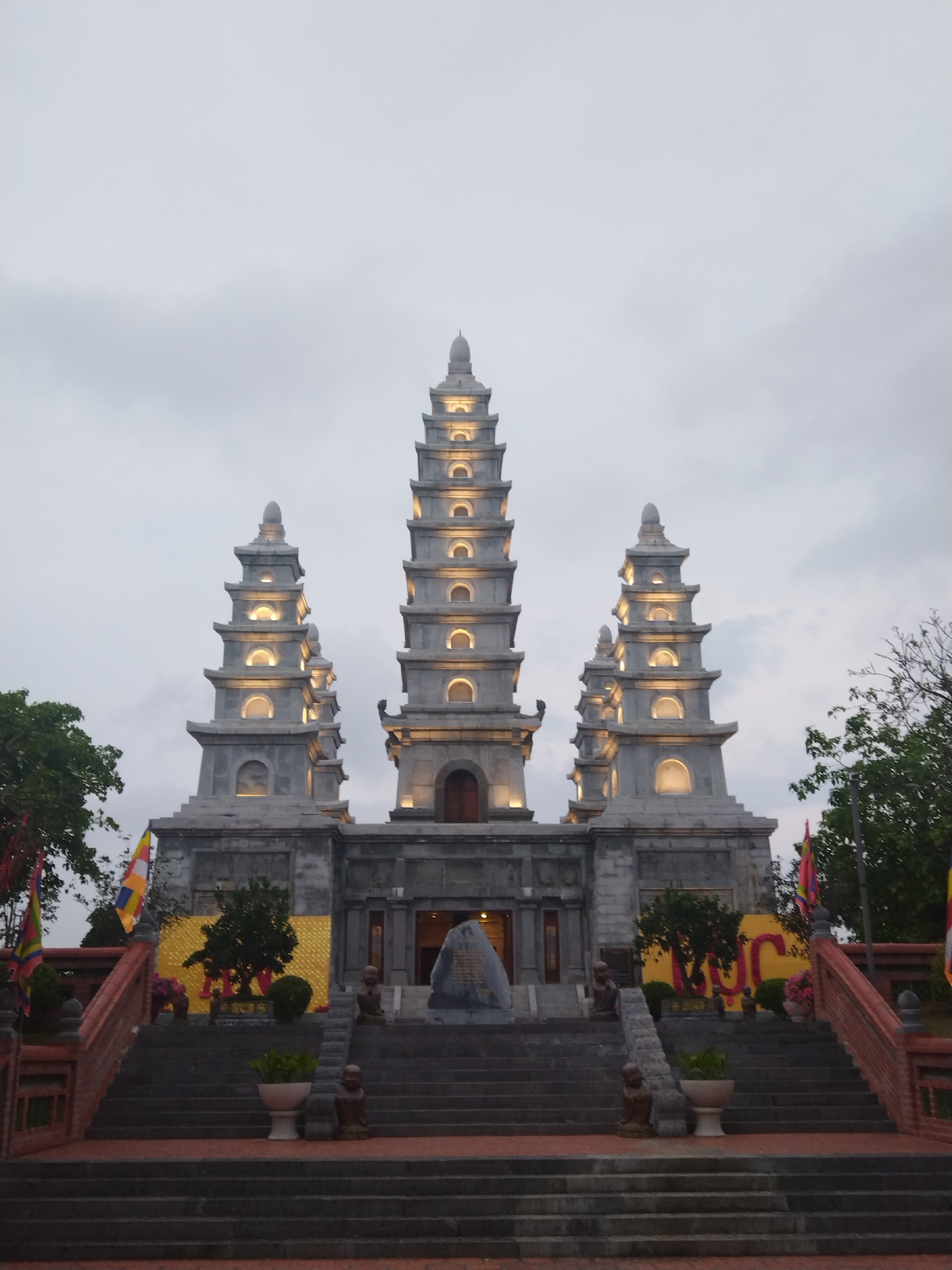 The image shows a Buddhist temple in Hong Gai Ward, Vietnam. The temple complex consists of three pagodas, the central one taller than the two flanking structures. The pagodas have a grey stone appear…read more