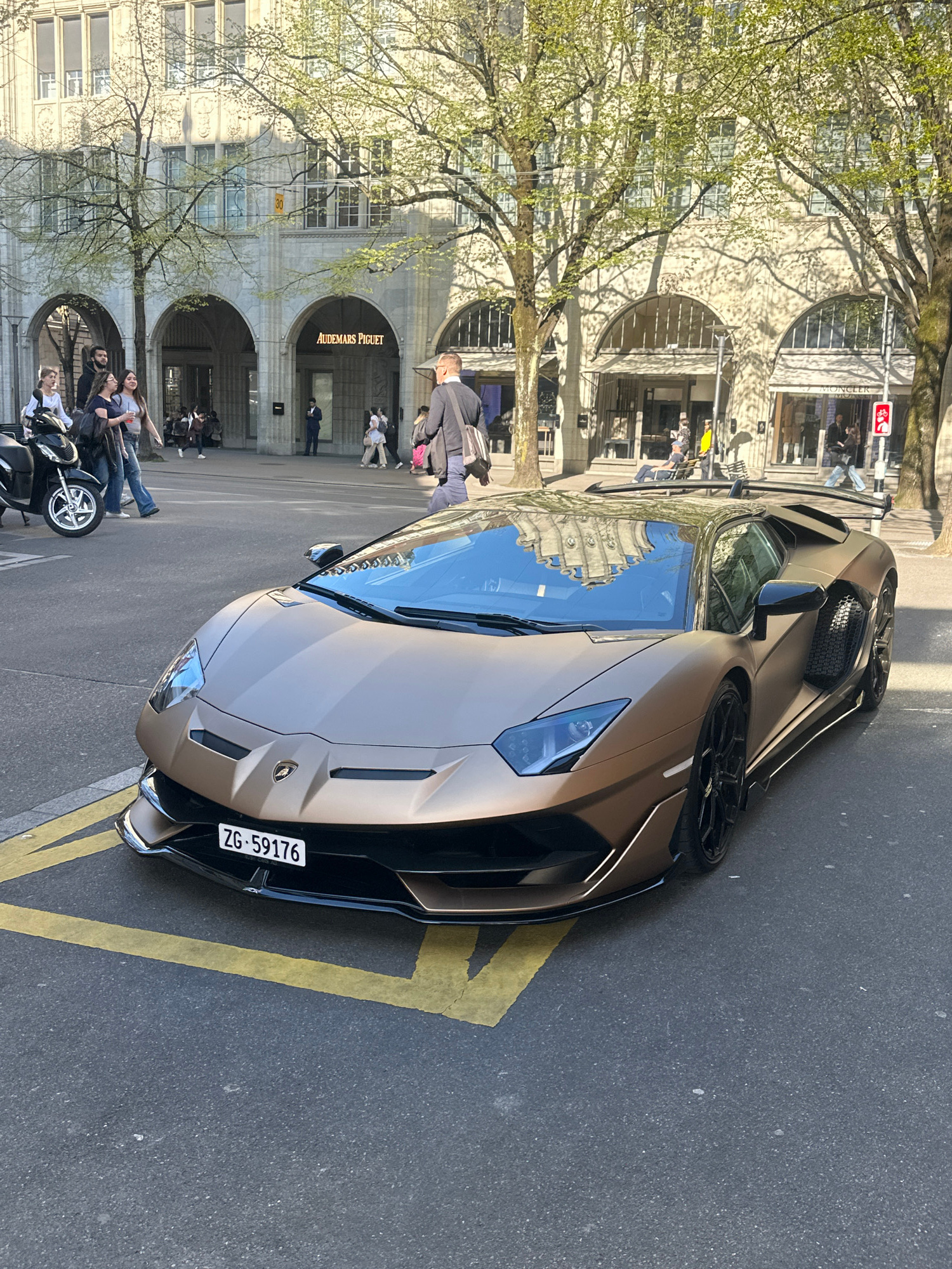 The image depicts a bronze-colored Lamborghini Aventador parked on a street in Zurich, Switzerland. The vehicle is angled towards the camera, showcasing its front end and the driver's side. The licens…read more