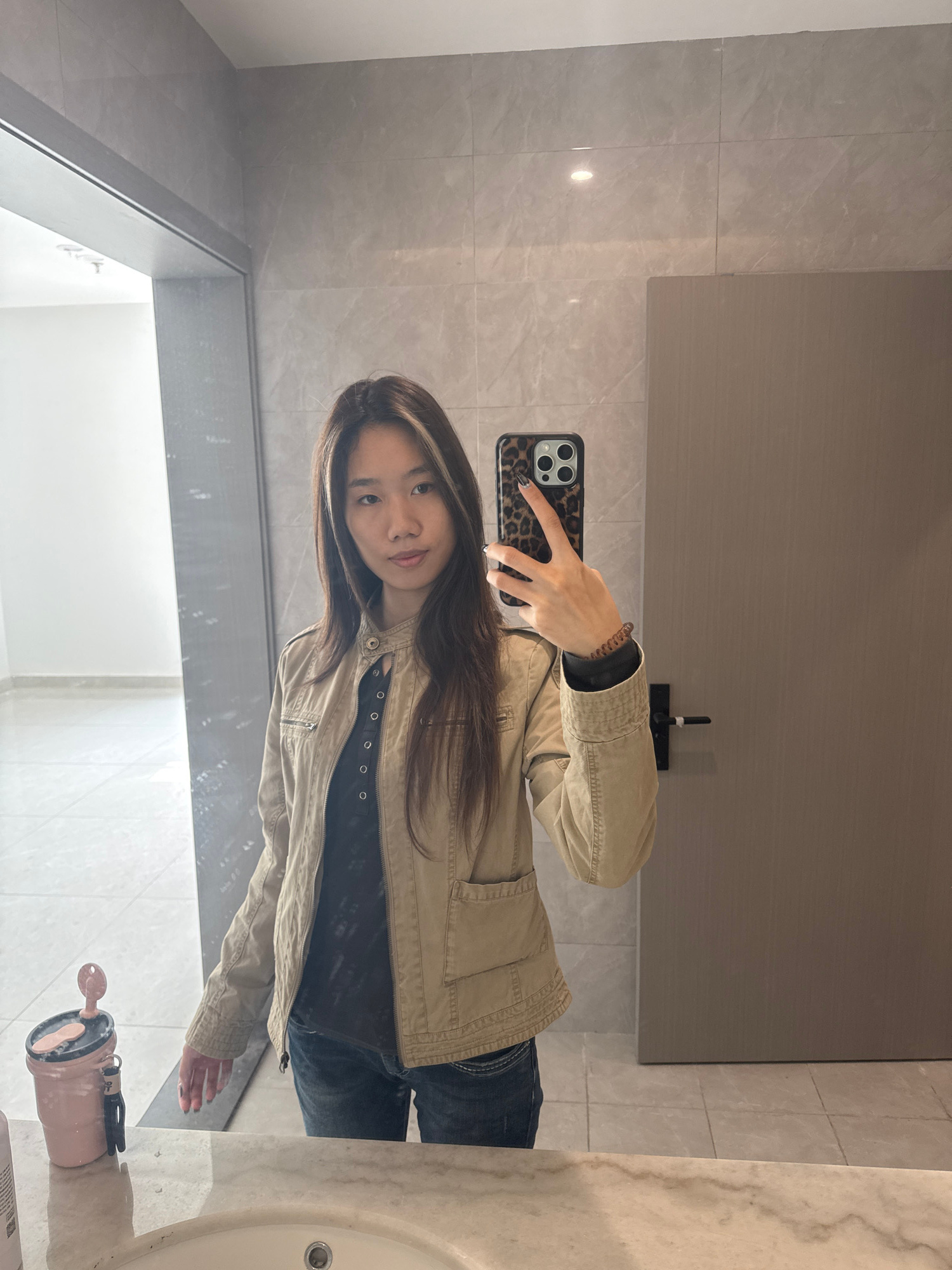 A person is taking a selfie in a bathroom. The bathroom has light grey tiled walls, a light brown cabinet, a white sink, and white walls. The person is holding a phone with a leopard print case and ha…read more