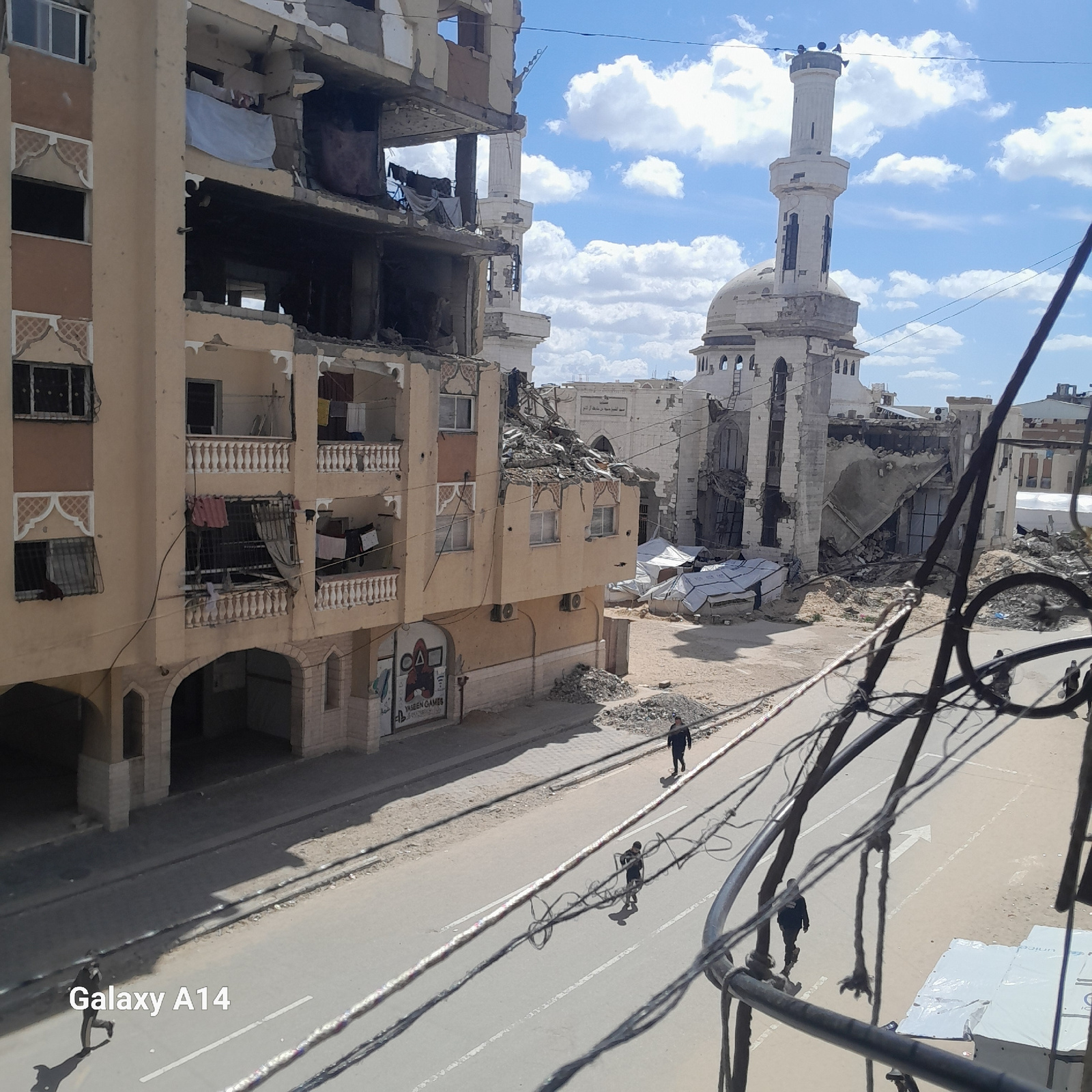 The image shows a scene of destruction in Khan Yunis, Palestinian Territory. A mosque with a minaret stands in the background, partially damaged. In the foreground, buildings are heavily damaged, withβ¦read more