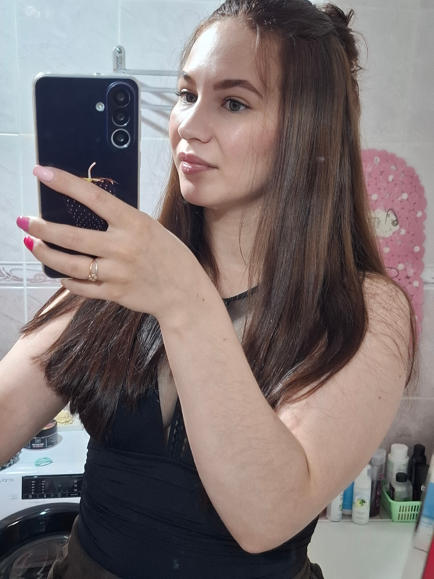 A young woman is taking a selfie in a bathroom. She has long brown hair and is wearing a black top. She is holding a dark-colored smartphone with multiple camera lenses. She has a ring on her finger a…read more