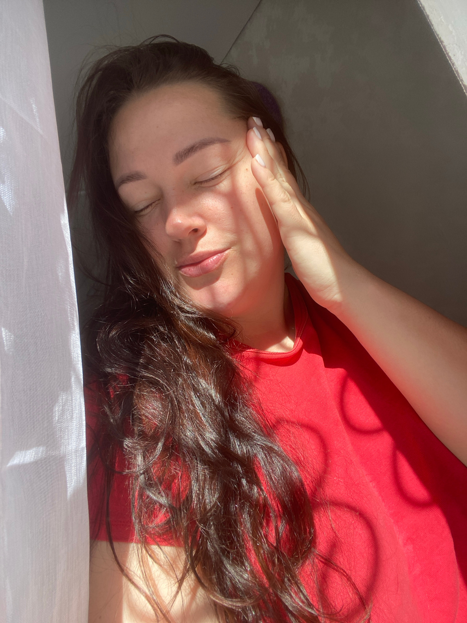 The image shows a woman lying down, likely indoors near a window in Sochi, Russia. She is wearing a red shirt and has dark, wavy hair. Her eyes are closed, and her hand is resting on her forehead, sug…read more