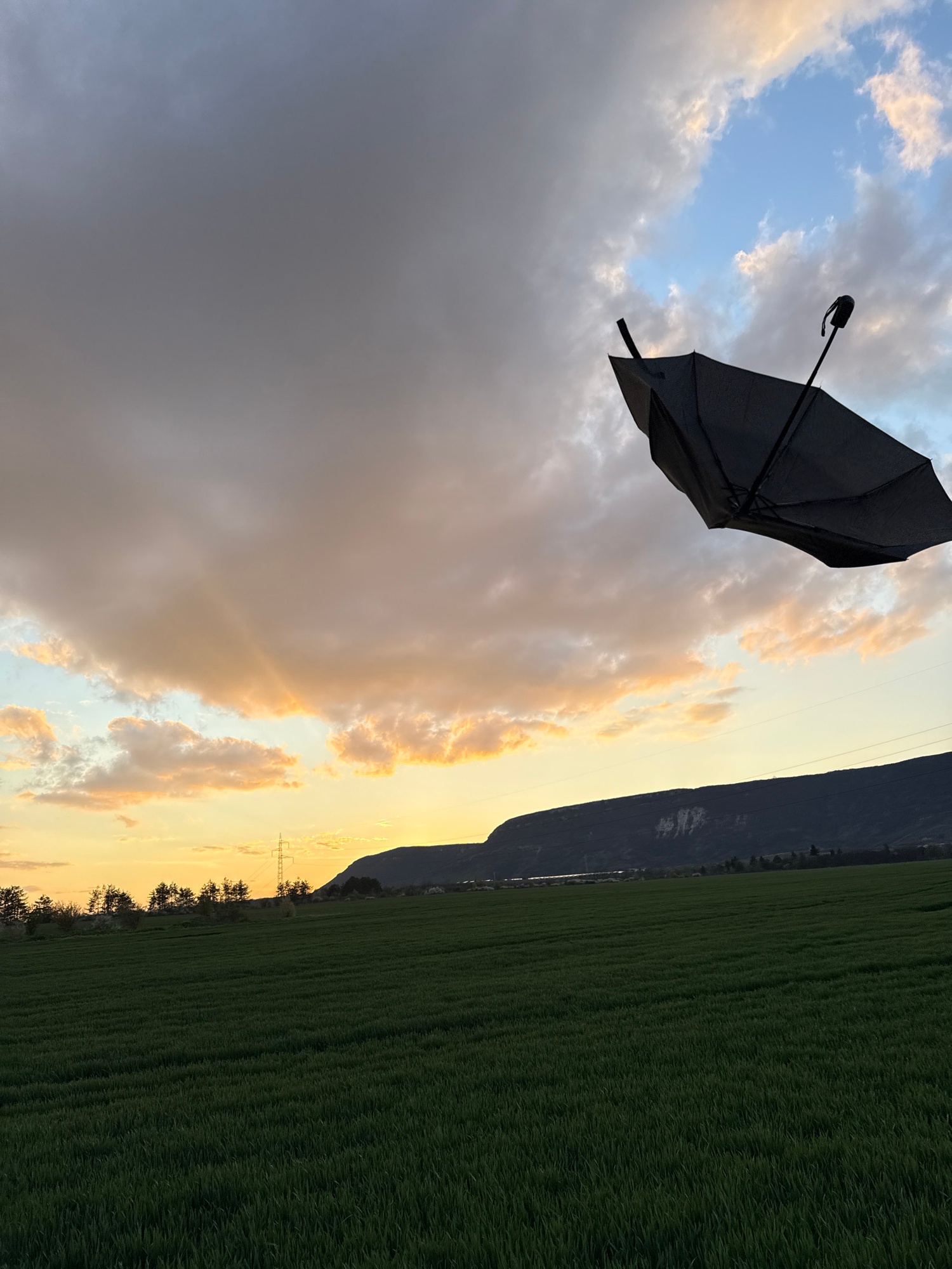 The image presents a striking outdoor landscape scene, likely captured during sunrise or sunset, in what appears to be a rural or semi-rural setting. The perspective is tilted, with the horizon line r…read more